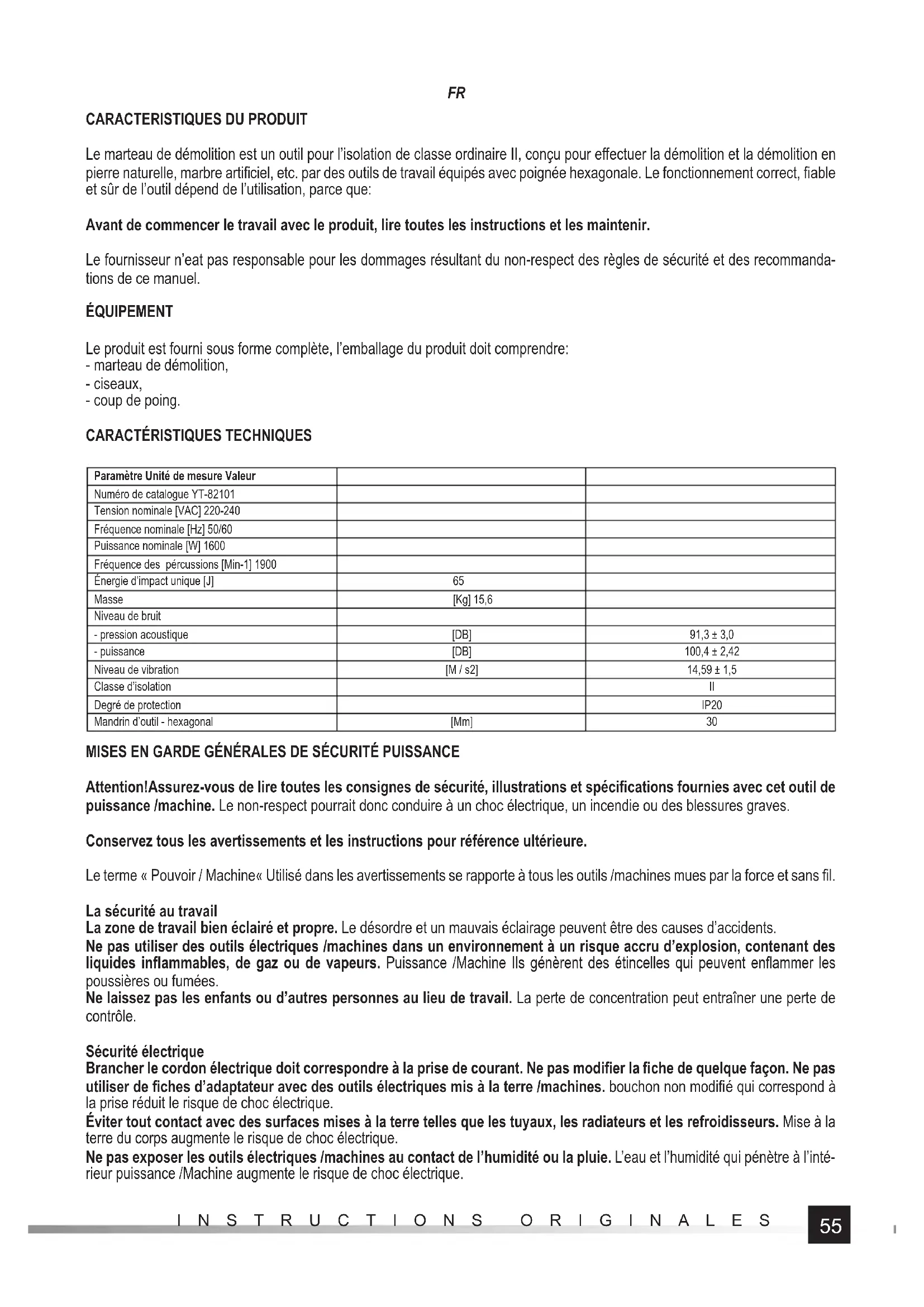 Paramètre Unité de mesure Valeur Numéro de catalogue YT-82101 Tension nominale [VAC] 220-240 Fréquence nominale [Hz] 50/60 Puissance nominale [W] 1600 Fréquence des pércussions [Min-1] 1900 Énergie d’impact unique [J] 65 Masse [Kg] 15,6 Niveau de bruit - pression acoustique [DB] 91,3 ± 3,0 - puissance [DB] 100,4 ± 2,42 Niveau de vibration [M / s2] 14,59 ± 1,5 Classe d’isolation II Degré de protection IP20 Mandrin d’outil - hexagonal [Mm] 30 MISES EN GARDE GÉNÉRALES DE SÉCURITÉ PUISSANCE Attention!Assurez-vous de lire toutes les consignes de sécurité, illustrations et spécifi cations fournies avec cet outil de puissance /machine. Le non-respect pourrait donc conduire à un choc électrique, un incendie ou des blessures graves. Conservez tous les avertissements et les instructions pour référence ultérieure. Le terme « Pouvoir / Machine« Utilisé dans les avertissements se rapporte à tous les outils /machines mues par la force et sans fi l. La sécurité au travail La zone de travail bien éclairé et propre. Le désordre et un mauvais éclairage peuvent être des causes d’accidents. Ne pas utiliser des outils électriques /machines dans un environnement à un risque accru d’explosion, contenant des liquides infl ammables, de gaz ou de vapeurs. Puissance /Machine Ils génèrent des étincelles qui peuvent enfl ammer les poussières ou fumées. Ne laissez pas les enfants ou d’autres personnes au lieu de travail. La perte de concentration peut entraîner une perte de contrôle. Sécurité électrique Brancher le cordon électrique doit correspondre à la prise de courant. Ne pas modifi er la fi che de quelque façon. Ne pas utiliser de fi ches d’adaptateur avec des outils électriques mis à la terre /machines. bouchon non modifi é qui correspond à la prise réduit le risque de choc électrique. Éviter tout contact avec des surfaces mises à la terre telles que les tuyaux, les radiateurs et les refroidisseurs. Mise à la terre du corps augmente le risque de choc électrique. Ne pas exposer les outils électriques /machines au contact de l’humidité ou la pluie. L’eau et l’humidité qui pénètre à l’inté- rieur puissance /Machine augmente le risque de choc électrique.56 INSTRUCTIONS ORIGINALES