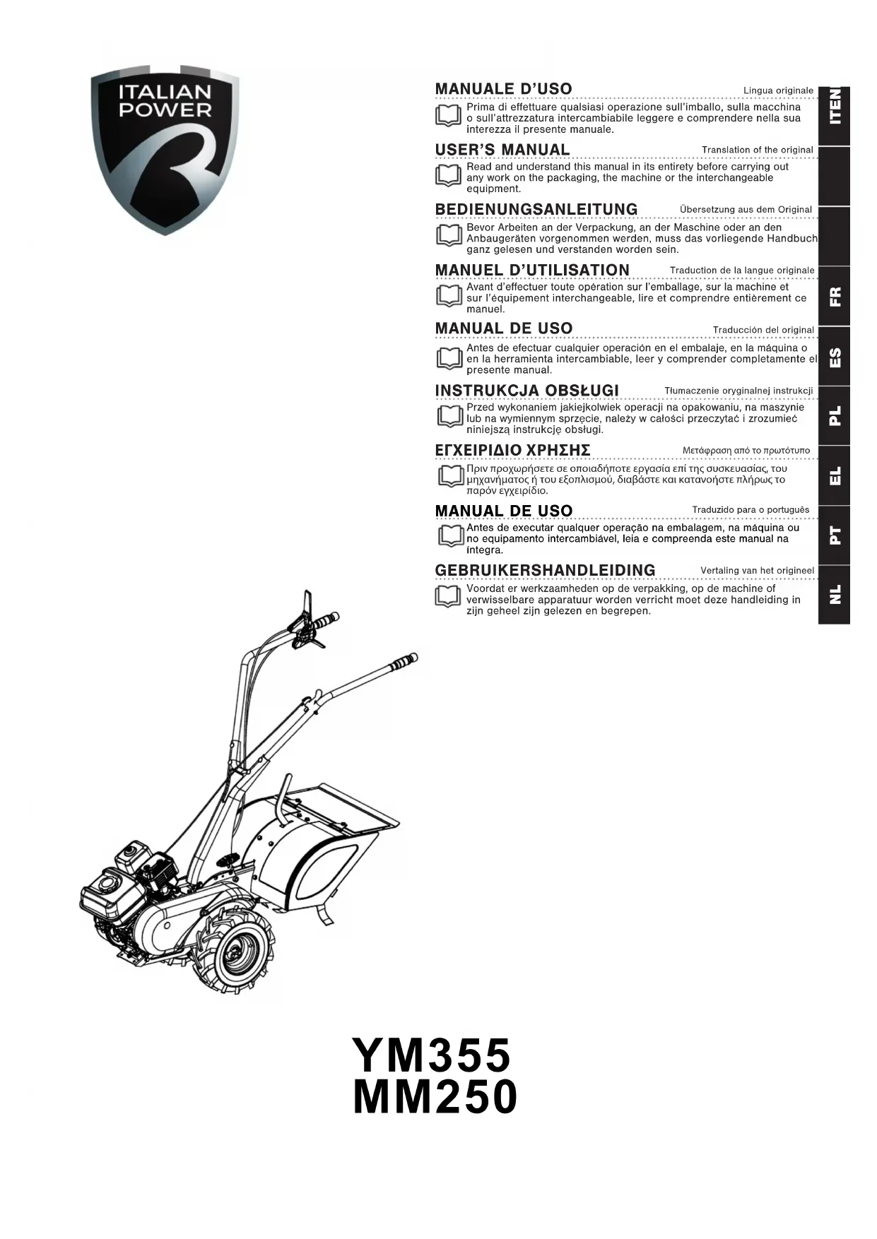 Modèle MM250 YM355 Poids BRUT et NET Étiquette déclaration CE sur la dernière page Puissance nominale Puissance acoustique Pression acoustique Vibrations Pneumatiques 13x5.00-6 Diamètre fraise 320 mm Rotation de l’arbre porte-fraise 275/min Vitesse marche avant en 1ère 1,1 km/h Vitesse marche avant en 2de - 2,1 km/h Vitesse marche arrière en 1ère 0,96 km/h Vitesse marche arrière en 2de - 1,8 km/h Pour les données techniques relatives au moteur, consulter le manuel d’instruction joint Pour déplacer l’emballage, la soulever à 2 ou plusieurs personnes en utilisant les poignées déposées sur le carton. Le poids BRUT est indiqué à l’intérieur du chapitre «CARACTÉRISTIQUES TECHNIQUES». ATTENTION ! Ne pas renverser ou faire rouler la ma- chine. Possible dommage de capots et organes mécaniques. INFORMATION! En cas de fourniture de plusieurs ma- chines ou équipements interchan- geables sur palette, les décharger sans les faire tomber au sol. S’aider éventuel- lement avec un chariot élévateur.