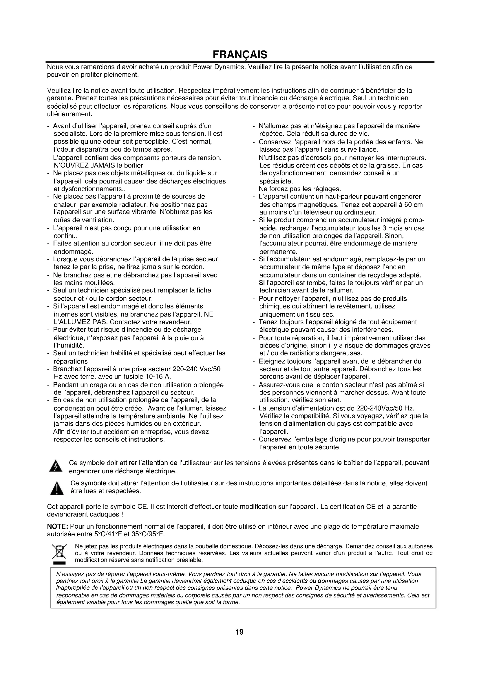 Si el fusible está defectuoso, reemplace el fusible por un fusible del mismo tipo y valor. Antes de sustituir el fusible, desconectar de la corriente. Procedimiento: Paso 1: Abra el portafusibles del panel trasero con un destornillador adecuado. Paso 2: Retire el fusible viejo del portafusibles. Paso 3: Instale el fusible nuevo en el portafusibles. Paso 4: Vuelva a colocar el portafusibles en la caja.19 FRANÇAIS Nous vous remercions d’avoir acheté un produit Power Dynamics. Veuillez lire la présente notice avant l’utilisation afin de pouvoir en profiter pleinement. Veuillez lire la notice avant toute utilisation. Respectez impérativement les instructions afin de continuer à bénéficier de la garantie. Prenez toutes les précautions nécessaires pour éviter tout incendie ou décharge électrique. Seul un technicien spécialisé peut effectuer les réparations. Nous vous conseillons de conserver la présente notice pour pouvoir vous y reporter ultérieurement. - Avant d’utiliser l’appareil, prenez conseil auprès d’un spécialiste. Lors de la première mise sous tension, il est possible qu’une odeur soit perceptible. C’est normal, l’odeur disparaîtra peu de temps après. - L’appareil contient des composants porteurs de tension. N’OUVREZ JAMAIS le boîtier. - Ne placez pas des objets métalliques ou du liquide sur l’appareil, cela pourrait causer des décharges électriques et dysfonctionnements.. - Ne placez pas l’appareil à proximité de sources de chaleur, par exemple radiateur. Ne positionnez pas l’appareil sur une surface vibrante. N’obturez pas les ouïes de ventilation. - L’appareil n’est pas conçu pour une utilisation en continu. - Faites attention au cordon secteur, il ne doit pas être endommagé. - Lorsque vous débranchez l’appareil de la prise secteur, tenez-le par la prise, ne tirez jamais sur le cordon. - Ne branchez pas et ne débranchez pas l’appareil avec les mains mouillées. - Seul un technicien spécialisé peut remplacer la fiche secteur et / ou le cordon secteur. - Si l’appareil est endommagé et donc les éléments internes sont visibles, ne branchez pas l’appareil, NE L’ALLUMEZ PAS. Contactez votre revendeur. - Pour éviter tout risque d’incendie ou de décharge électrique, n’exposez pas l’appareil à la pluie ou à l’humidité. - Seul un technicien habilité et spécialisé peut effectuer les réparations - Branchez l’appareil à une prise secteur 220-240 Vac/50 Hz avec terre, avec un fusible 10-16 A. - Pendant un orage ou en cas de non utilisation prolongée de l’appareil, débranchez l’appareil du secteur. - En cas de non utilisation prolongée de l’appareil, de la condensation peut être créée. Avant de l’allumer, laissez l’appareil atteindre la température ambiante. Ne l’utilisez jamais dans des pièces humides ou en extérieur. - Afin d’éviter tout accident en entreprise, vous devez respecter les conseils et instructions. - N’allumez pas et n’éteignez pas l’appareil de manière répétée. Cela réduit sa durée de vie. - Conservez l’appareil hors de la portée des enfants. Ne laissez pas l’appareil sans surveillance. - N’utilisez pas d’aérosols pour nettoyer les interrupteurs. Les résidus créent des dépôts et de la graisse. En cas de dysfonctionnement, demandez conseil à un spécialiste. - Ne forcez pas les réglages. - L’appareil contient un haut-parleur pouvant engendrer des champs magnétiques. Tenez cet appareil à 60 cm au moins d’un téléviseur ou ordinateur. - Si le produit comprend un accumulateur intégré plomb- acide, rechargez l'accumulateur tous les 3 mois en cas de non utilisation prolongée de l'appareil. Sinon, l'accumulateur pourrait être endommagé de manière permanente. - Si l’accumulateur est endommagé, remplacez-le par un accumulateur de même type et déposez l’ancien accumulateur dans un container de recyclage adapté. - Si l’appareil est tombé, faites-le toujours vérifier par un technicien avant de le rallumer. - Pour nettoyer l’appareil, n’utilisez pas de produits chimiques qui abîment le revêtement, utilisez uniquement un tissu sec. - Tenez toujours l’appareil éloigné de tout équipement électrique pouvant causer des interférences. - Pour toute réparation, il faut impérativement utiliser des pièces d’origine, sinon il y a risque de dommages graves et / ou de radiations dangereuses. - Eteignez toujours l’appareil avant de le débrancher du secteur et de tout autre appareil. Débranchez tous les cordons avant de déplacer l’appareil. - Assurez-vous que le cordon secteur n’est pas abîmé si des personnes viennent à marcher dessus. Avant toute utilisation, vérifiez son état. - La tension d’alimentation est de 220-240Vac/50 Hz. Vérifiez la compatibilité. Si vous voyagez, vérifiez que la tension d’alimentation du pays est compatible avec l’appareil. - Conservez l’emballage d’origine pour pouvoir transporter l’appareil en toute sécurité. Ce symbole doit attirer l’attention de l’utilisateur sur les tensions élevées présentes dans le boîtier de l’appareil, pouvant engendrer une décharge électrique. Ce symbole doit attirer l’attention de l’utilisateur sur des instructions importantes détaillées dans la notice, elles doivent être lues et respectées. Cet appareil porte le symbole CE. Il est interdit d’effectuer toute modification sur l’appareil. La certification CE et la garantie deviendraient caduques ! NOTE: Pour un fonctionnement normal de l’appareil, il doit être utilisé en intérieur avec une plage de température maximale autorisée entre 5°C/41°F et 35°C/95°F. Ne jetez pas les produits électriques dans la poubelle domestique. Déposez-les dans une décharge. Demandez conseil aux autorisés ou à votre revendeur. Données techniques réservées. Les valeurs actuelles peuvent varier d’un produit à l’autre. Tout droit de modification réservé 