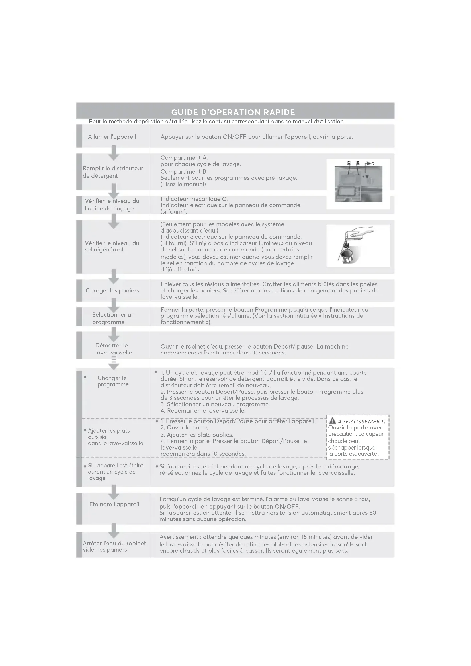 80GSDW6003EW NECompartiment A: pour chaque cycle de lavage. Compartiment B: Seulement pour les programmes avec pré-lavage. (Lisez le manuel) Indicateur mécanique C. Indicateur électrique sur le panneau de commande (si fourni). Vérifier le niveau du liquide de rinçage Vérifier le niveau du sel régénérant Charger les paniers Sélectionner un programme Démarrer le lave-vaisselle Eteindre l'appareil Arrêter l'eau du robinet vider les paniers Remplir le distributeur de détergent Changer le programme Ajouter les plats oubliés dans le lave-vaisselle. Si l'appareil est éteint durant un cycle de lavage Ouvrir la porte avec précaution. La vapeur chaude peut s'échapper lorsque la porte est ouverte ! AVERTISSEMENT! Allumer l'appareil