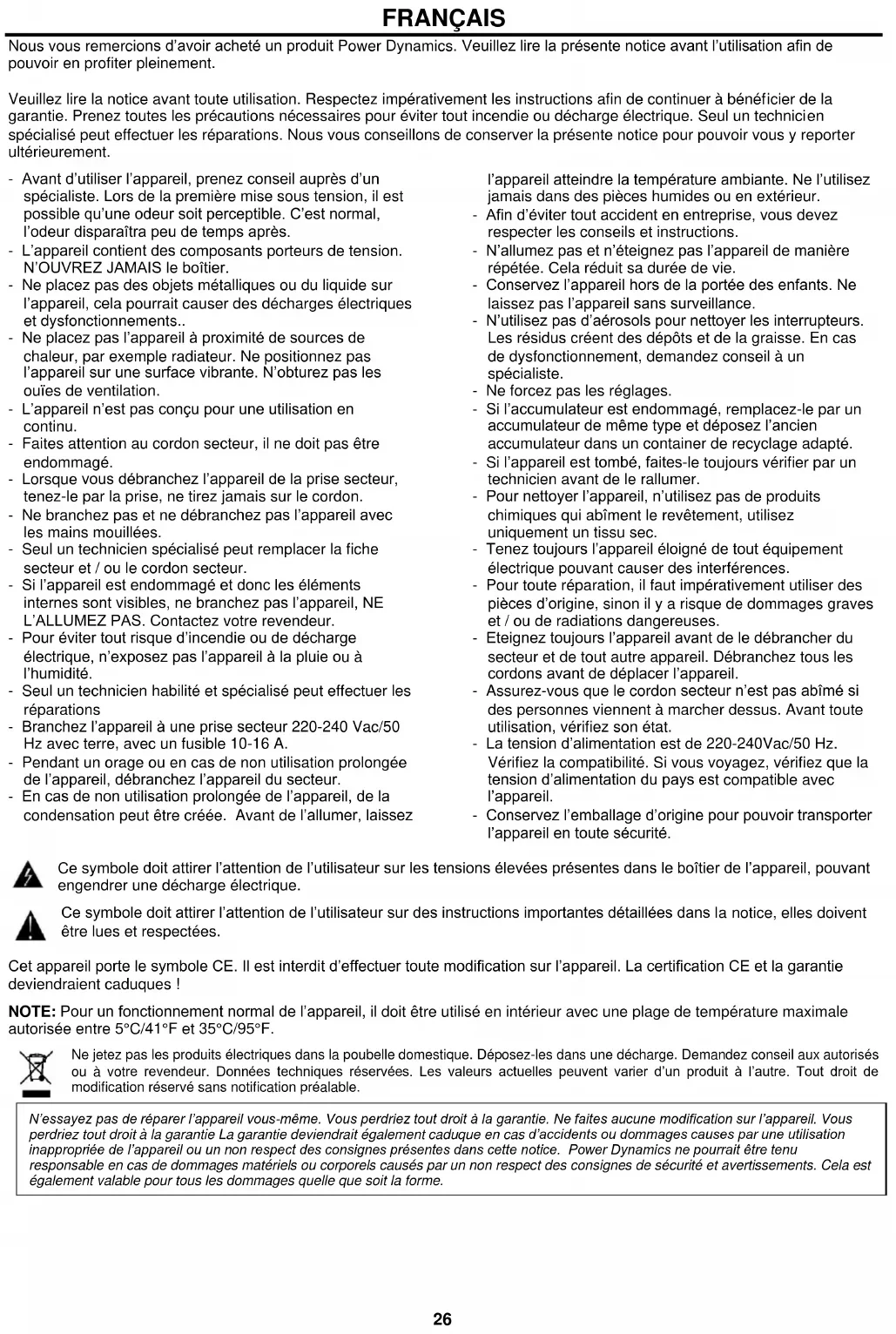Cuando se conecte y use el BT, asegúrese de ajustar la antena BT a una posición vertical para garantizar la mejor señal inalámbrica posible.26 FRANÇAIS Nous vous remercions d’avoir acheté un produit Power Dynamics. Veuillez lire la présente notice avant l’utilisation afin de pouvoir en profiter pleinement. Veuillez lire la notice avant toute utilisation. Respectez impérativement les instructions afin de continuer à bénéficier de la garantie. Prenez toutes les précautions nécessaires pour éviter tout incendie ou décharge électrique. Seul un technicien spécialisé peut effectuer les réparations. Nous vous conseillons de conserver la présente notice pour pouvoir vous y reporter ultérieurement. - Avant d’utiliser l’appareil, prenez conseil auprès d’un spécialiste. Lors de la première mise sous tension, il est possible qu’une odeur soit perceptible. C’est normal, l’odeur disparaîtra peu de temps après. - L’appareil contient des composants porteurs de tension. N’OUVREZ JAMAIS le boîtier. - Ne placez pas des objets métalliques ou du liquide sur l’appareil, cela pourrait causer des décharges électriques et dysfonctionnements.. - Ne placez pas l’appareil à proximité de sources de chaleur, par exemple radiateur. Ne positionnez pas l’appareil sur une surface vibrante. N’obturez pas les ouïes de ventilation. - L’appareil n’est pas conçu pour une utilisation en continu. - Faites attention au cordon secteur, il ne doit pas être endommagé. - Lorsque vous débranchez l’appareil de la prise secteur, tenez-le par la prise, ne tirez jamais sur le cordon. - Ne branchez pas et ne débranchez pas l’appareil avec les mains mouillées. - Seul un technicien spécialisé peut remplacer la fiche secteur et / ou le cordon secteur. - Si l’appareil est endommagé et donc les éléments internes sont visibles, ne branchez pas l’appareil, NE L’ALLUMEZ PAS. Contactez votre revendeur. - Pour éviter tout risque d’incendie ou de décharge électrique, n’exposez pas l’appareil à la pluie ou à l’humidité. - Seul un technicien habilité et spécialisé peut effectuer les réparations - Branchez l’appareil à une prise secteur 220-240 Vac/50 Hz avec terre, avec un fusible 10-16 A. - Pendant un orage ou en cas de non utilisation prolongée de l’appareil, débranchez l’appareil du secteur. - En cas de non utilisation prolongée de l’appareil, de la condensation peut être créée. Avant de l’allumer, laissez l’appareil atteindre la température ambiante. Ne l’utilisez jamais dans des pièces humides ou en extérieur. - Afin d’éviter tout accident en entreprise, vous devez respecter les conseils et instructions. - N’allumez pas et n’éteignez pas l’appareil de manière répétée. Cela réduit sa durée de vie. - Conservez l’appareil hors de la portée des enfants. Ne laissez pas l’appareil sans surveillance. - N’utilisez pas d’aérosols pour nettoyer les interrupteurs. Les résidus créent des dépôts et de la graisse. En cas de dysfonctionnement, demandez conseil à un spécialiste. - Ne forcez pas les réglages. - Si l’accumulateur est endommagé, remplacez-le par un accumulateur de même type et déposez l’ancien accumulateur dans un container de recyclage adapté. - Si l’appareil est tombé, faites-le toujours vérifier par un technicien avant de le rallumer. - Pour nettoyer l’appareil, n’utilisez pas de produits chimiques qui abîment le revêtement, utilisez uniquement un tissu sec. - Tenez toujours l’appareil éloigné de tout équipement électrique pouvant causer des interférences. - Pour toute réparation, il faut impérativement utiliser des pièces d’origine, sinon il y a risque de dommages graves et / ou de radiations dangereuses. - Eteignez toujours l’appareil avant de le débrancher du secteur et de tout autre appareil. Débranchez tous les cordons avant de déplacer l’appareil. - Assurez-vous que le cordon secteur n’est pas abîmé si des personnes viennent à marcher dessus. Avant toute utilisation, vérifiez son état. - La tension d’alimentation est de 220-240Vac/50 Hz. Vérifiez la compatibilité. Si vous voyagez, vérifiez que la tension d’alimentation du pays est compatible avec l’appareil. - Conservez l’emballage d’origine pour pouvoir transporter l’appareil en toute sécurité. Ce symbole doit attirer l’attention de l’utilisateur sur les tensions élevées présentes dans le boîtier de l’appareil, pouvant engendrer une décharge électrique. Ce symbole doit attirer l’attention de l’utilisateur sur des instructions importantes détaillées dans la notice, elles doivent être lues et respectées. Cet appareil porte le symbole CE. Il est interdit d’effectuer toute modification sur l’appareil. La certification CE et la garantie deviendraient caduques ! NOTE: Pour un fonctionnement normal de l’appareil, il doit être utilisé en intérieur avec une plage de température maximale autorisée entre 5°C/41°F et 35°C/95°F. Ne jetez pas les produits électriques dans la poubelle domestique. Déposez-les dans une décharge. Demandez conseil aux autorisés ou à votre revendeur. Données techniques réservées. Les valeurs actuelles peuvent varier d’un produit à l’autre. Tout droit de modification réservé sans notification préalable. N’essayez pas de réparer l’appareil vous-même. Vous perdriez tout droit à la garantie. Ne faites aucune modification sur l’appareil. Vous perdriez tout droit à la garantie La garantie deviendrait également caduque en cas d’accidents ou dommages causes par une utilisation inappropriée de l’appareil ou un non respect des consignes présentes dans cette notice. Power Dynamics ne pourrait être tenu responsable en cas de dommages matériels ou corporels causés par un non respect des consignes de sécurité et avertissements. Cela est également valable pour tous les dommages quelle que soit la fo