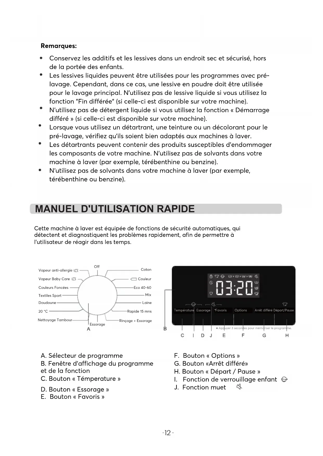Appuyer 3 secondes pour mémoriser le programme.Vapeur anti-allergieVapeur Baby CareCouleurs FoncéesTextiles SportDoudoune20 °C Off EssorageCotonCouleurEco 40-60 Mix LaineRapide 15 mnsRinçage + EssorageTempératureEssorage Favoris OptionsArrêt différé Départ/PauseNettoyage Tambour A. Sélecteur de programme B. Fenêtre d'affichage du programme et de la fonction C. Bouton « Témperature » D. Bouton « Essorage » E. Bouton « Favoris » F. Bouton « Options » G. Bouton «Arrêt différé» H. Bouton « Départ / Pause »