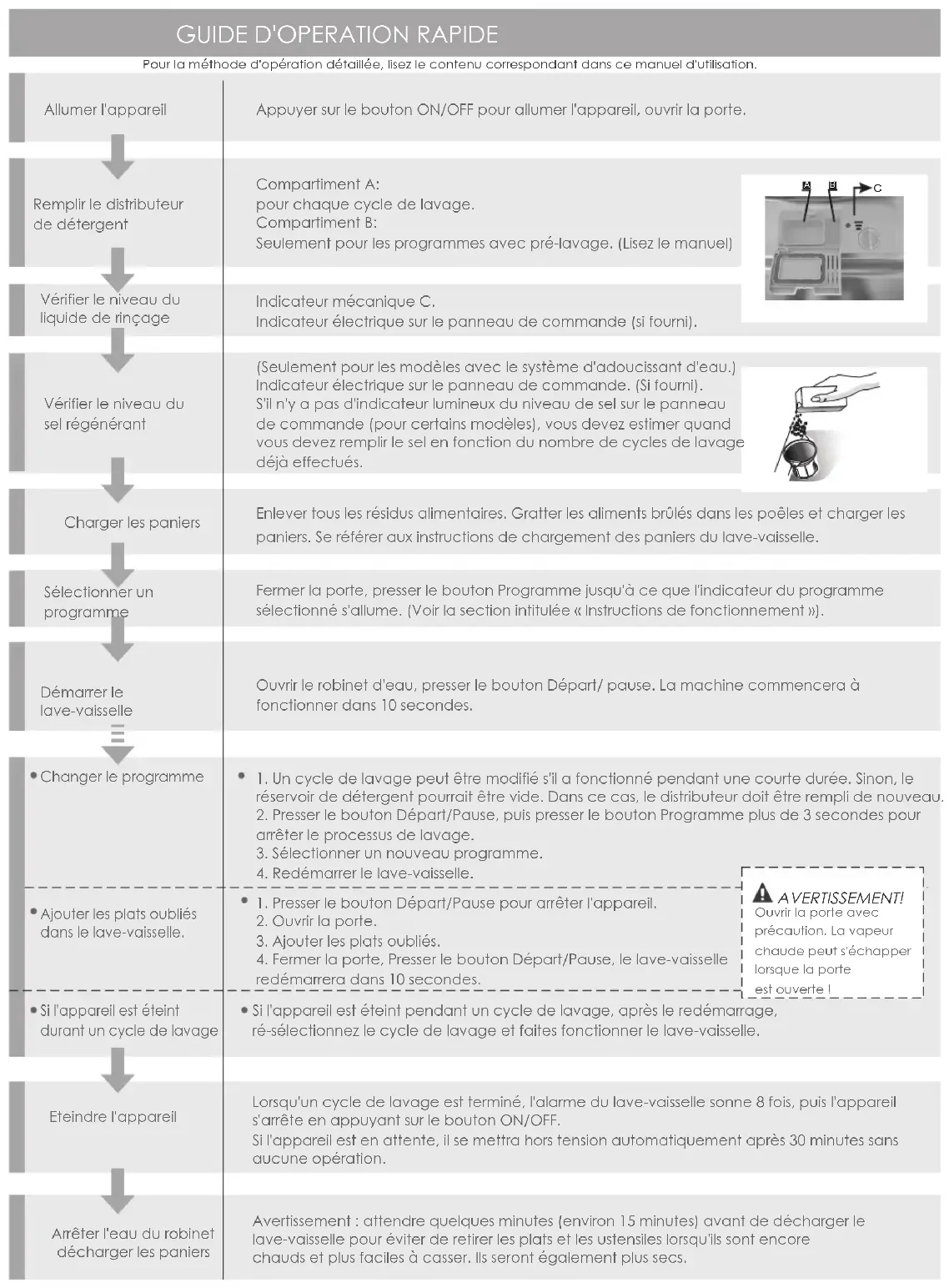 80GSDW8003EW NECompartiment A: pour chaque cycle de lavage. Compartiment B: Seulement pour les programmes avec pré-lavage. (Lisez le manuel) Indicateur mécanique C. Indicateur électrique sur le panneau de commande (si fourni). Vérifier le niveau du liquide de rinçage Vérifier le niveau du sel régénérant Charger les paniers Sélectionner un programme Démarrer le lave-vaisselle Eteindre l'appareil Arrêter l'eau du robinet Remplir le distributeur de détergent Changer le programme Ajouter les plats oubliés dans le lave-vaisselle. Si l'appareil est éteint durant un cycle de lavage Ouvrir la porte avec précaution. La vapeur chaude peut s'échapper lorsque la porte est ouverte ! AVERTISSEMENT! Allumer l'appareil