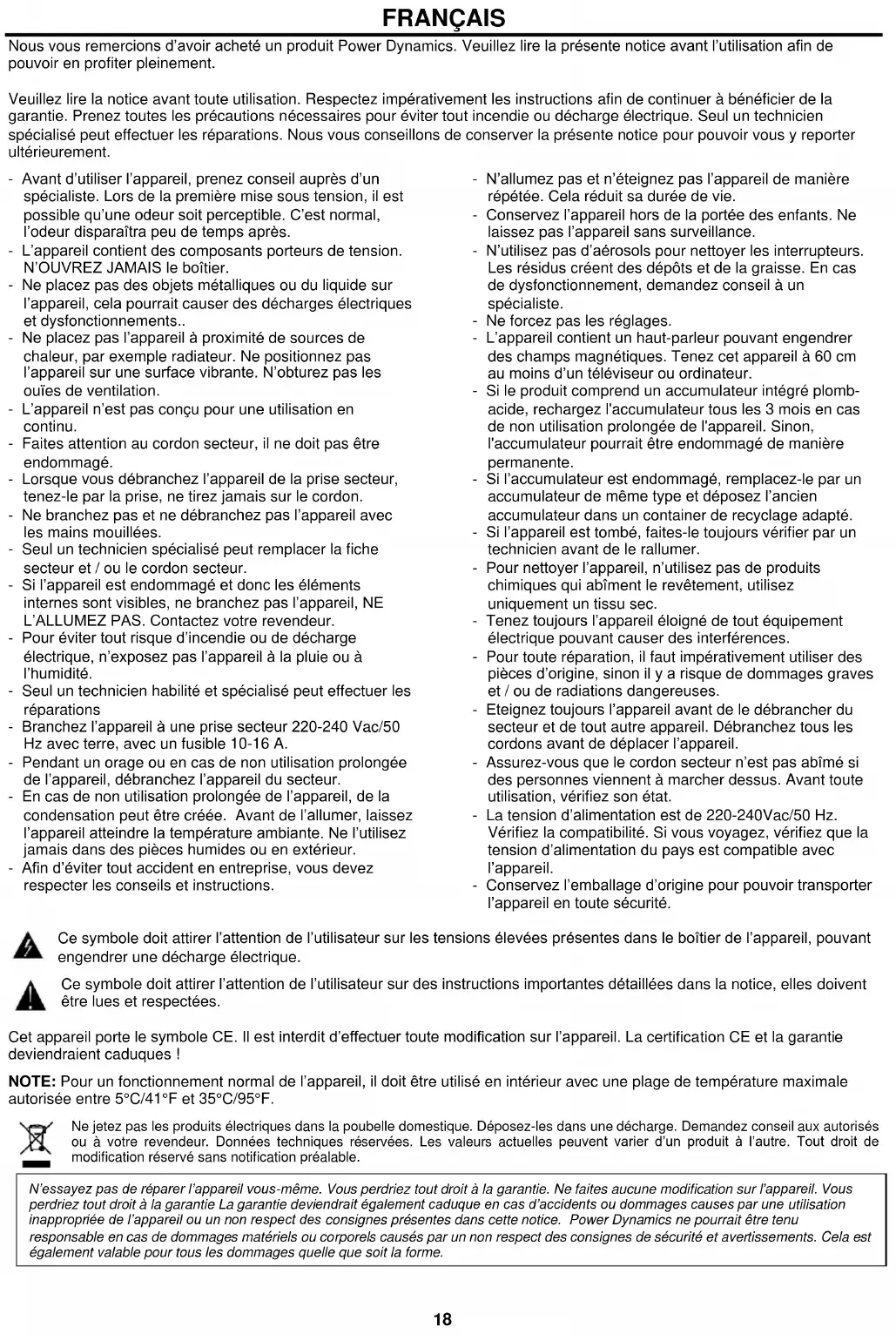 Si el fusible está defectuoso, reemplácelo por uno del mismo tipo y valor. Antes de reemplazar el fusible, desenchufe el cable de alimentación. Procedimiento: Paso 1: abra el portafusibles en el panel trasero con un destornillador apropiado. Paso 2: Retire el fusible viejo del portafusibles. Paso 3: Instale el fusible nuevo en el portafusibles. Paso 4: Reemplace el portafusibles en la carcasa.18 FRANÇAIS Nous vous remercions d’avoir acheté un produit Power Dynamics. Veuillez lire la présente notice avant l’utilisation afin de pouvoir en profiter pleinement. Veuillez lire la notice avant toute utilisation. Respectez impérativement les instructions afin de continuer à bénéficier de la garantie. Prenez toutes les précautions nécessaires pour éviter tout incendie ou décharge électrique. Seul un technicien spécialisé peut effectuer les réparations. Nous vous conseillons de conserver la présente notice pour pouvoir vous y reporter ultérieurement. - Avant d’utiliser l’appareil, prenez conseil auprès d’un spécialiste. Lors de la première mise sous tension, il est possible qu’une odeur soit perceptible. C’est normal, l’odeur disparaîtra peu de temps après. - L’appareil contient des composants porteurs de tension. N’OUVREZ JAMAIS le boîtier. - Ne placez pas des objets métalliques ou du liquide sur l’appareil, cela pourrait causer des décharges électriques et dysfonctionnements.. - Ne placez pas l’appareil à proximité de sources de chaleur, par exemple radiateur. Ne positionnez pas l’appareil sur une surface vibrante. N’obturez pas les ouïes de ventilation. - L’appareil n’est pas conçu pour une utilisation en continu. - Faites attention au cordon secteur, il ne doit pas être endommagé. - Lorsque vous débranchez l’appareil de la prise secteur, tenez-le par la prise, ne tirez jamais sur le cordon. - Ne branchez pas et ne débranchez pas l’appareil avec les mains mouillées. - Seul un technicien spécialisé peut remplacer la fiche secteur et / ou le cordon secteur. - Si l’appareil est endommagé et donc les éléments internes sont visibles, ne branchez pas l’appareil, NE L’ALLUMEZ PAS. Contactez votre revendeur. - Pour éviter tout risque d’incendie ou de décharge électrique, n’exposez pas l’appareil à la pluie ou à l’humidité. - Seul un technicien habilité et spécialisé peut effectuer les réparations - Branchez l’appareil à une prise secteur 220-240 Vac/50 Hz avec terre, avec un fusible 10-16 A. - Pendant un orage ou en cas de non utilisation prolongée de l’appareil, débranchez l’appareil du secteur. - En cas de non utilisation prolongée de l’appareil, de la condensation peut être créée. Avant de l’allumer, laissez l’appareil atteindre la température ambiante. Ne l’utilisez jamais dans des pièces humides ou en extérieur. - Afin d’éviter tout accident en entreprise, vous devez respecter les conseils et instructions. - N’allumez pas et n’éteignez pas l’appareil de manière répétée. Cela réduit sa durée de vie. - Conservez l’appareil hors de la portée des enfants. Ne laissez pas l’appareil sans surveillance. - N’utilisez pas d’aérosols pour nettoyer les interrupteurs. Les résidus créent des dépôts et de la graisse. En cas de dysfonctionnement, demandez conseil à un spécialiste. - Ne forcez pas les réglages. - L’appareil contient un haut-parleur pouvant engendrer des champs magnétiques. Tenez cet appareil à 60 cm au moins d’un téléviseur ou ordinateur. - Si le produit comprend un accumulateur intégré plomb- acide, rechargez l'accumulateur tous les 3 mois en cas de non utilisation prolongée de l'appareil. Sinon, l'accumulateur pourrait être endommagé de manière permanente. - Si l’accumulateur est endommagé, remplacez-le par un accumulateur de même type et déposez l’ancien accumulateur dans un container de recyclage adapté. - Si l’appareil est tombé, faites-le toujours vérifier par un technicien avant de le rallumer. - Pour nettoyer l’appareil, n’utilisez pas de produits chimiques qui abîment le revêtement, utilisez uniquement un tissu sec. - Tenez toujours l’appareil éloigné de tout équipement électrique pouvant causer des interférences. - Pour toute réparation, il faut impérativement utiliser des pièces d’origine, sinon il y a risque de dommages graves et / ou de radiations dangereuses. - Eteignez toujours l’appareil avant de le débrancher du secteur et de tout autre appareil. Débranchez tous les cordons avant de déplacer l’appareil. - Assurez-vous que le cordon secteur n’est pas abîmé si des personnes viennent à marcher dessus. Avant toute utilisation, vérifiez son état. - La tension d’alimentation est de 220-240Vac/50 Hz. Vérifiez la compatibilité. Si vous voyagez, vérifiez que la tension d’alimentation du pays est compatible avec l’appareil. - Conservez l’emballage d’origine pour pouvoir transporter l’appareil en toute sécurité. Ce symbole doit attirer l’attention de l’utilisateur sur les tensions élevées présentes dans le boîtier de l’appareil, pouvant engendrer une décharge électrique. Ce symbole doit attirer l’attention de l’utilisateur sur des instructions importantes détaillées dans la notice, elles doivent être lues et respectées. Cet appareil porte le symbole CE. Il est interdit d’effectuer toute modification sur l’appareil. La certification CE et la garantie deviendraient caduques ! NOTE: Pour un fonctionnement normal de l’appareil, il doit être utilisé en intérieur avec une plage de température maximale autorisée entre 5°C/41°F et 35°C/95°F. Ne jetez pas les produits électriques dans la poubelle domestique. Déposez-les dans une décharge. Demandez conseil aux autorisés ou à votre revendeur. Données techniques réservées. Les valeurs actuelles peuvent varier d’un produit à l’autre. Tout droit de modification réservé sans n