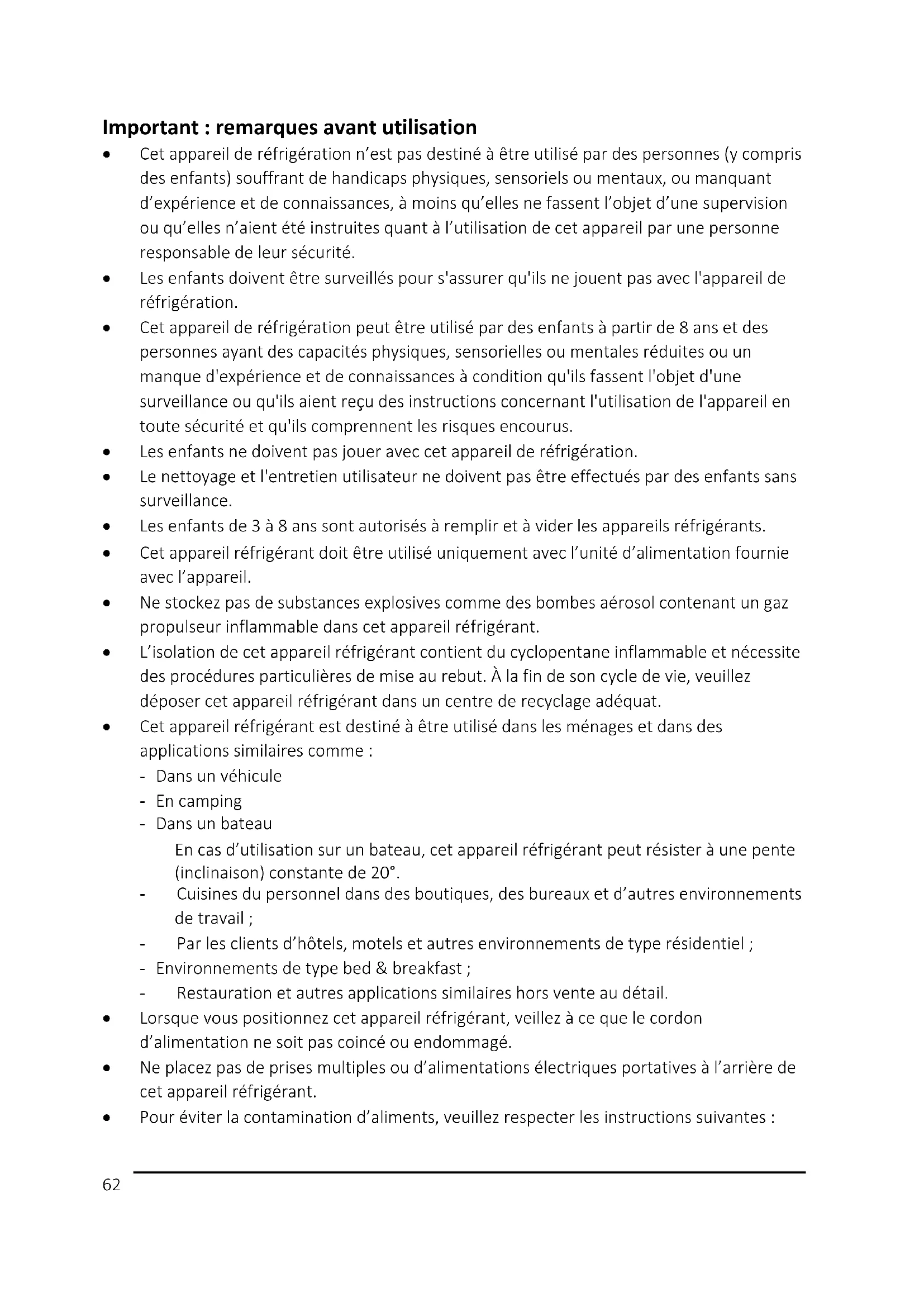 - Cet appareil réfrigérant est destiné à être utilisé dans les ménages et dans des applications similaires comme : - Dans un véhicule - En camping - Dans un bateau En cas d’utilisation sur un bateau, cet appareil réfrigérant peut résister à une pente (inclinaison) constante de 20°. - Cuisines du personnel dans des boutiques, des bureaux et d’autres environnements de travail ; - Par les clients d’hôtels, motels et autres environnements de type résidentiel ; - Environnements de type bed & breakfast ; - Restauration et autres applications similaires hors vente au détail.