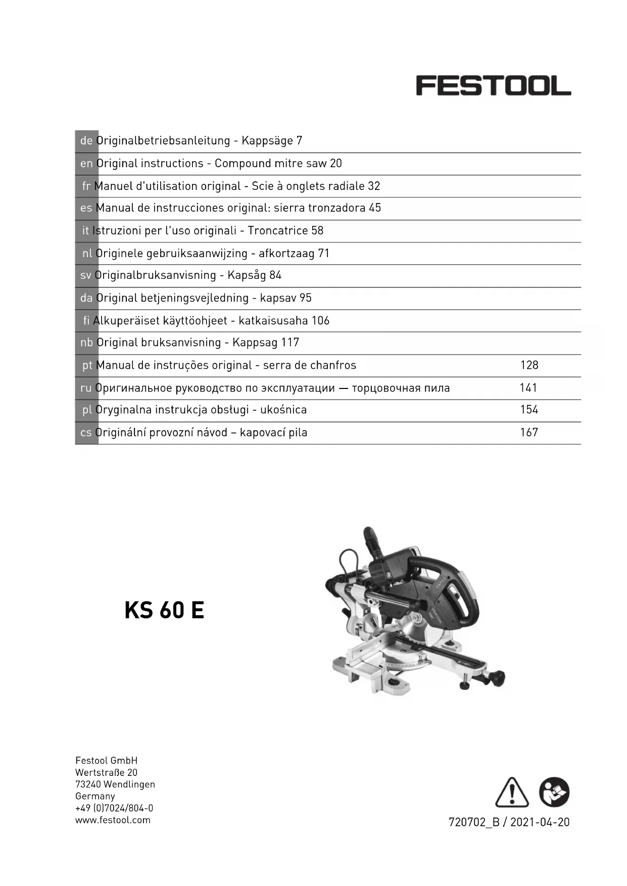 Retrouvez gratuitement la notice de l'appareil KS 60 E FESTOOL au format PDF.