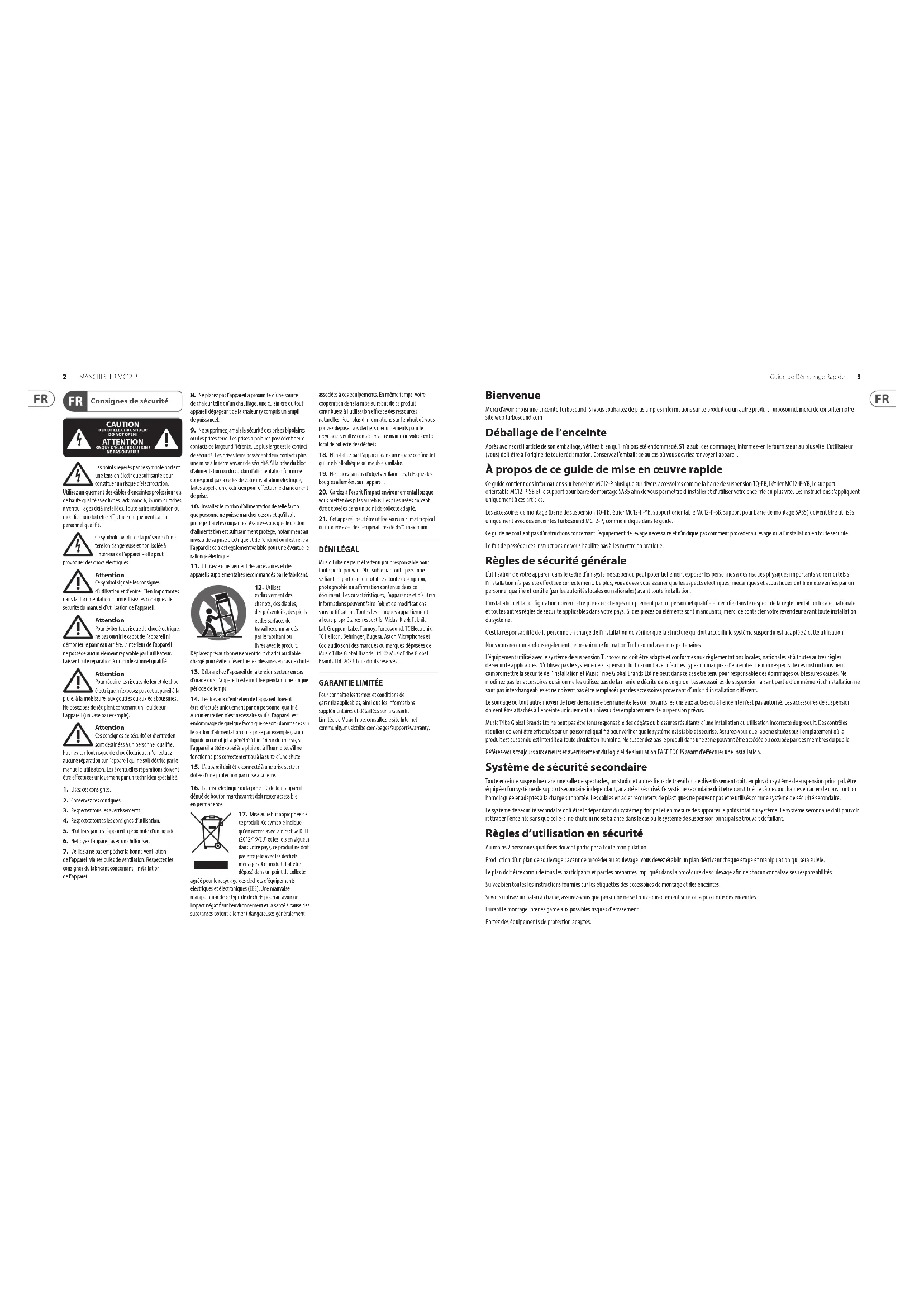 Guide de Démarrage Rapide MANCHESTER Series MC12-P Full Size 12" Point Source Asymmetrical Element for Install and Touring MC12-P-SB Swivel Bracket for MC12-P Loudspeakers MC12-P-YB Yoke Bracket for MC12-P Loudspeakers SA-35 Stand Adapter for Turbosound Yoke Brackets to 35mm Speaker Stands TQ-FB Fly Bar for TQ and MC12-P Series Loudspeakers V 0.02 MANCHESTER MC12-P Guide de Démarrage Rapide 3 Bienvenue Merci d’avoir choisi une enceinte Turbosound. Si vous souhaitez de plus amples informations sur ce produit ou un autre produit Turbosound, merci de consulter notre site web turbosound.com Déballage de l’enceinte Après avoir sorti l’article de son emballage, vériez bien qu’il n’a pas été endommagé. S’il a subi des dommages, informez-en le fournisseur au plus vite. L’utilisateur (vous) doit être à l’origine de toute réclamation. Conservez l’emballage au cas où vous devriez renvoyer l’appareil. À propos de ce guide de mise en œuvre rapide Ce guide contient des informations sur l’enceinte MC12-P ainsi que sur divers accessoires comme la barre de suspension TQ-FB, l’étrier MC12-P-YB, le support orientable MC12-P-SB et le support pour barre de montage SA35 an de vous permettre d’installer et d’utiliser votre enceinte au plus vite. Les instructions s’appliquent uniquement à ces articles. Les accessoires de montage (barre de suspension TQ-FB, étrier MC12-P-YB, support orientable MC12-P-SB, support pour barre de montage SA35) doivent être utilisés uniquement avec des enceintes Turbosound MC12-P, comme indiqué dans le guide. Ce guide ne contient pas d’instructions concernant l’équipement de levage nécessaire et n’indique pas comment procéder au levage ou à l’installation en toute sécurité. Le fait de posséder ces instructions ne vous habilite pas à les mettre en pratique. Règles de sécurité générale L’utilisation de votre appareil dans le cadre d’un système suspendu peut potentiellement exposer les personnes à des risques physiques importants voire mortels si l’installation n’a pas été eectuée correctement. De plus, vous devez vous assurer que les aspects électriques, mécaniques et acoustiques ont bien été vériés par un personnel qualié et certié (par les autorités locales ou nationales) avant toute installation. L'installation et la conguration doivent être prises en charges uniquement par un personnel qualié et certié dans le respect de la règlementation locale, nationale et toutes autres règles de sécurité applicables dans votre pays. Si des pièces ou éléments sont manquants, merci de contacter votre revendeur avant toute installation du système. C’est la responsabilité de la personne en charge de l’installation de vérier que la structure qui doit accueillir le système suspendu est adaptée à cette utilisation. Nous vous recommandons également de prévoir une formation Turbosound avec nos partenaires. L’équipement utilisé avec le système de suspension Turbosound doit être adapté et conformes aux règlementations locales, nationales et à toutes autres règles de sécurité applicables. N’utilisez pas le système de suspension Turbosound avec d’autres types ou marques d’enceintes. Le non respects de ces instructions peut compromettre la sécurité de l’installation et Music Tribe Global Brands Ltd ne peut dans ce cas être tenu pour responsable des dommages ou blessures causés. Ne modiez pas les accessoires ou sinon ne les utilisez pas de la manière décrite dans ce guide. Les accessoires de suspension faisant partie d’un même kit d’installation ne sont pas interchangeables et ne doivent pas être remplacés par des accessoires provenant d’un kit d’installation diérent. Le soudage ou tout autre moyen de xer de manière permanente les composants les uns aux autres ou à l’enceinte n’est pas autorisé. Les accessoires de suspension doivent être attachés à l’enceinte uniquement au niveau des emplacements de suspension prévus. Music Tribe Global Brands Ltd ne peut pas être tenu responsable des dégâts ou blessures résultants d’une installation ou utilisation incorrecte du produit. Des contrôles réguliers doivent être eectués par un personnel qualié pour vérier que le système est stable et sécurisé. Assurez-vous que la zone située sous l’emplacement où le produit est suspendu est interdite à toute circulation humaine. Ne suspendez pas le produit dans une zone pouvant être accédée ou occupée par des membres du public. Référez-vous toujours aux erreurs et avertissement du logiciel de simulation EASE FOCUS avant d’eectuer une installation. Système de sécurité secondaire Toute enceinte suspendue dans une salle de spectacles, un studio et autres lieux de travail ou de divertissement doit, en plus du système de suspension principal, être équipée d’un système de support secondaire indépendant, adapté et sécurisé. Ce système secondaire doit être constitué de câbles ou chaines en acier de construction homologuée et adaptés à la charge supportée. Les câbles en acier recouverts de plastiques ne peuvent pas être utilisés comme système de sécurité secondaire. Le système de sécurité secondaire doit être indépendant du système principal et en mesure de supporter le poids total du système. Le système secondaire doit pouvoir rattraper l’enceinte sans que celle-ci ne chute ni ne se balance dans le cas où le système de suspension principal se trouvait défaillant. Règles d’utilisation en sécurité Au moins 2 personnes qualiées doivent participer à toute manipulation. Production d’un plan de soulevage : avant de procéder au soulevage, vous devez établir un plan décrivant chaque étape et manipulation qui sera suivie. Le plan doit être connu de tous les participants et parties prenantes impliqués dans la procédure de soulevage an de chacun connaisse ses responsabilités. Suivez bien toutes les in