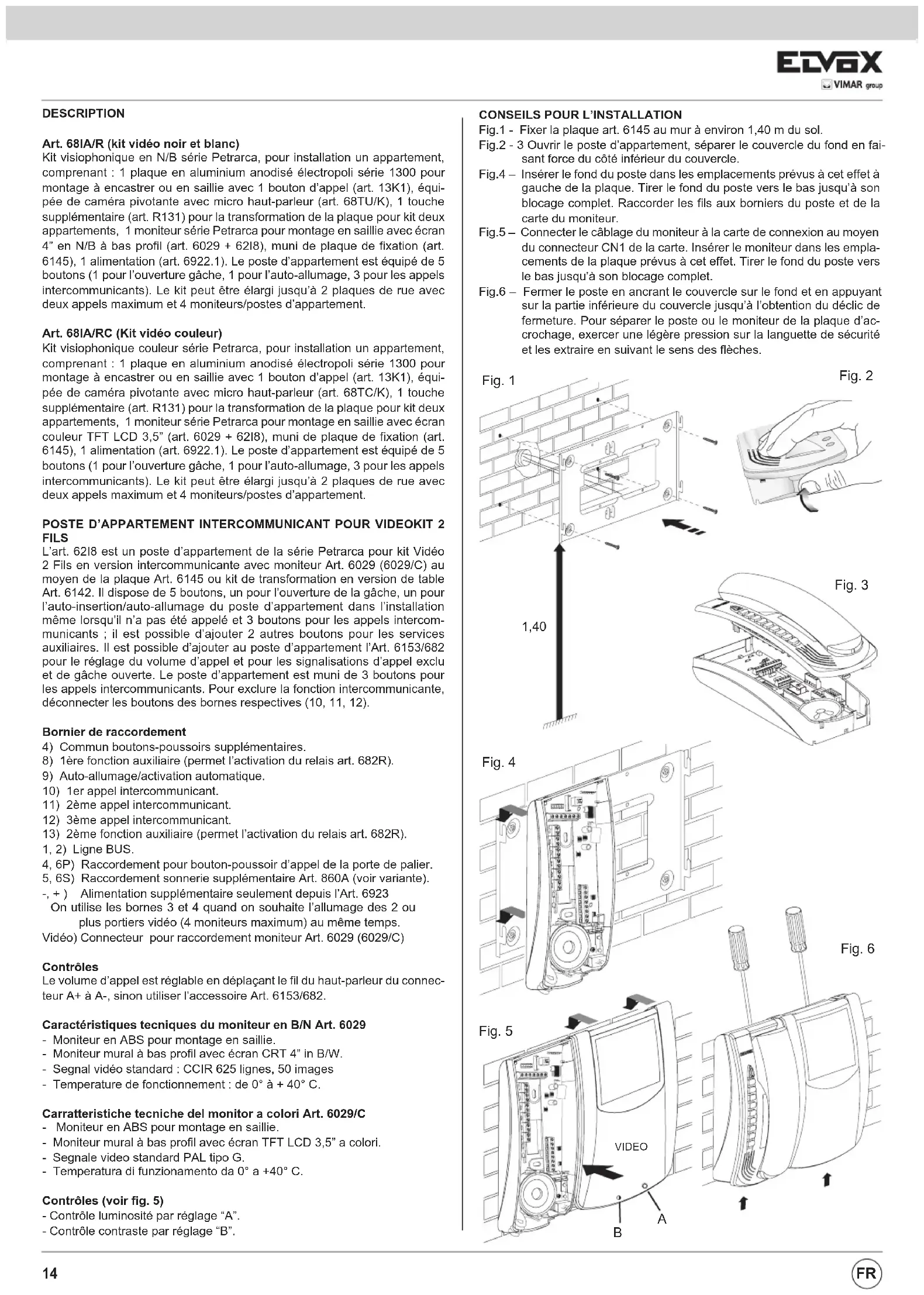 1, 2) Ligne BUS. 4, 6P) Raccordement pour bouton-poussoir d’appel de la porte de palier. 5, 6S) Raccordement sonnerie supplémentaire Art. 860A (voir variante). -, + ) Alimentation supplémentaire seulement depuis l’Art. 6923 On utilise les bornes 3 et 4 quand on souhaite l’allumage des 2 ou plus portiers vidéo (4 moniteurs maximum) au même temps. Vidéo) Connecteur pour raccordement moniteur Art. 6029 (6029/C) Contrôles Le volume d’appel est réglable en déplaçant le fil du haut-parleur du connec- teur A+ à A-, sinon utiliser l’accessoire Art. 6153/682. Caractéristiques tecniques du moniteur en B/N Art. 6029 - Moniteur en ABS pour montage en saillie. - Moniteur mural à bas profil avec écran CRT 4” in B/W. - Segnal vidéo standard : CCIR 625 lignes, 50 images - Temperature de fonctionnement : de 0° à + 40° C. Carratteristiche tecniche del monitor a colori Art. 6029/C - Moniteur en ABS pour montage en saillie. - Moniteur mural à bas profil avec écran TFT LCD 3,5” a colori. - Segnale video standard PAL tipo G. - Temperatura di funzionamento da 0° a +40° C. Contrôles (voir fig. 5) - Contrôle luminosité par réglage “A”. - Contrôle contraste par réglage “B”.
