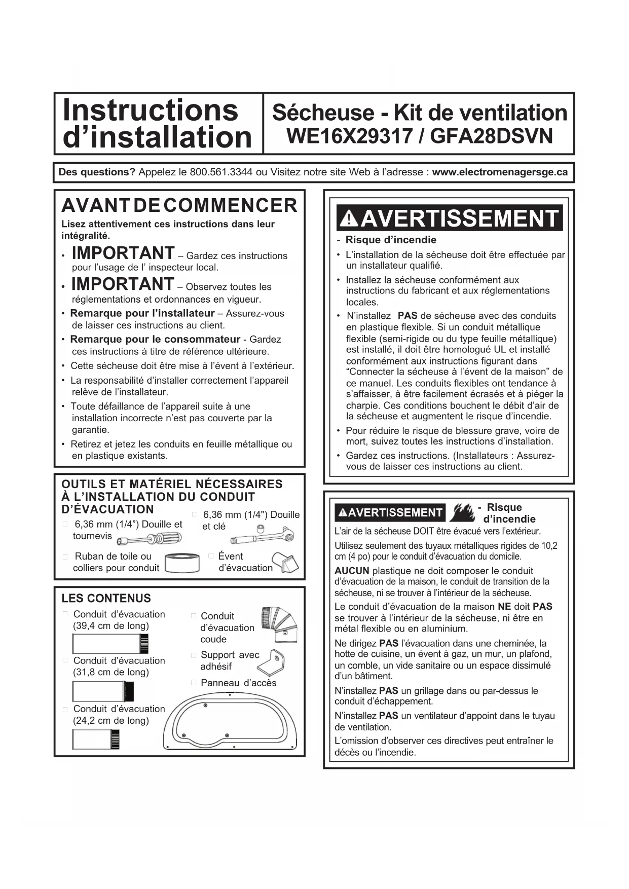 - Insert and connect the elbow/exhaust duct assembly to the blower housing and insert the elbow through the bottom knockout. Printed in USADes questions? Appelez le 800.561.3344 ou Visitez notre site Web à l’adresse : www.electromenagersge.ca - Risque d’incendie• L’installation de la sécheuse doit être effectuée par un installateur qualifié.• Installez la sécheuse conformément aux instructions du fabricant et aux réglementations locales.• N’installez PAS de sécheuse avec des conduits en plastique flexible. Si un conduit métallique flexible (semi-rigide ou du type feuille métallique) est installé, il doit être homologué UL et installé conformément aux instructions figurant dans “Connecter la sécheuse à l’évent de la maison” de ce manuel. Les conduits flexibles ont tendance à s’affaisser, à être facilement écrasés et à piéger la charpie. Ces conditions bouchent le débit d’air de la sécheuse et augmentent le risque d’incendie.• Pour réduire le risque de blessure grave, voire de mort, suivez toutes les instructions d’installation.• Gardez ces instructions. (Installateurs : Assurez-vous de laisser ces instructions au client.