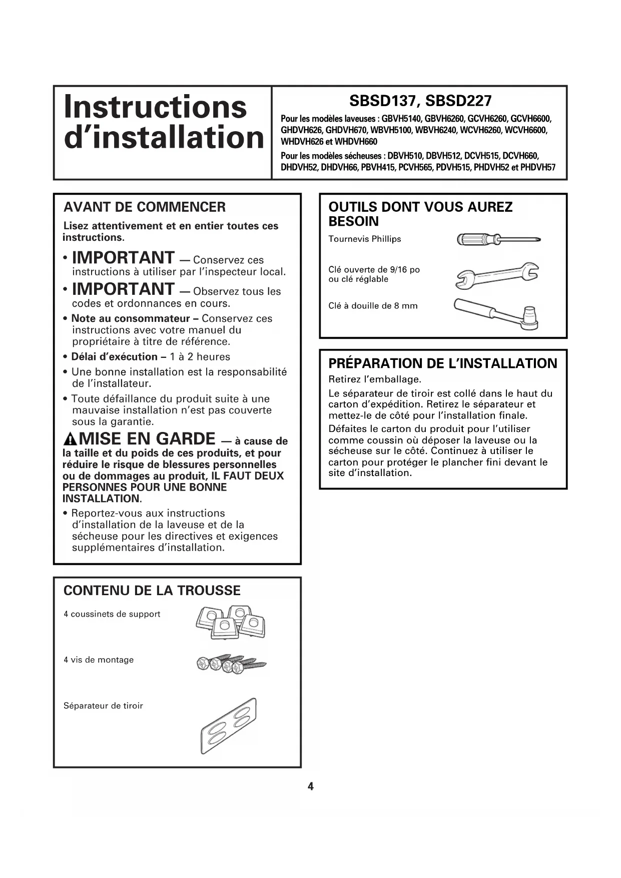 IMPORTANT — Observez tous les codes et ordonnances en cours.• Note au consommateur – Conservez cesinstructions avec votre manuel dupropriétaire à titre de référence.• Délai d’exécution – 1 à 2 heures • Une bonne installation est la responsabilitéde l’installateur.• Toute défaillance du produit suite à unemauvaise installation n’est pas couvertesous la garantie. MISE EN GARDE — à cause de la taille et du poids de ces produits, et pourréduire le risque de blessures personnellesou de dommages au produit, IL FAUT DEUXPERSONNES POUR UNE BONNEINSTALLATION.• Reportez-vous aux instructionsd’installation de la laveuse et de lasécheuse pour les directives et exigencessupplémentaires d’installation. SBSD137, SBSD227