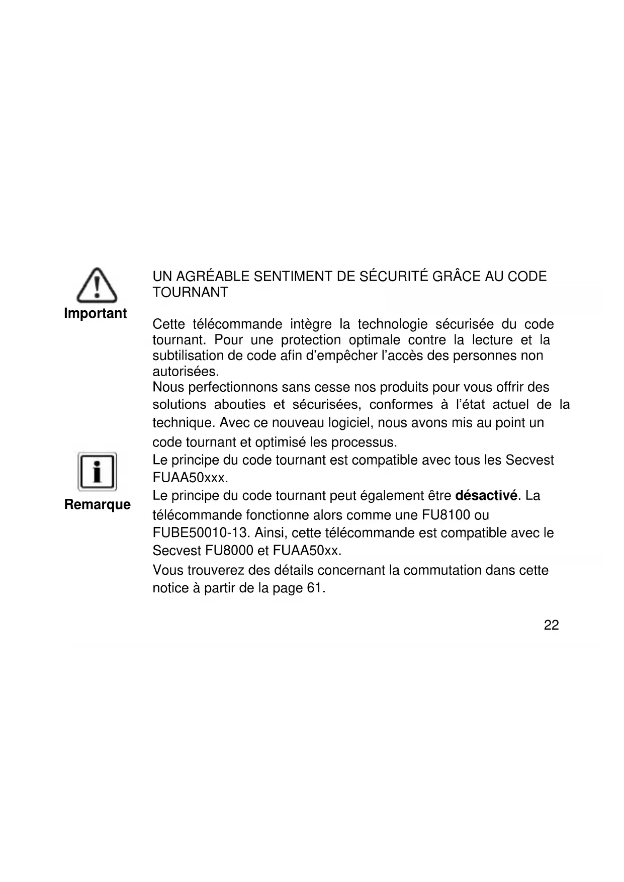 Important UN AGRÉABLE SENTIMENT DE SÉCURITÉ GRÂCE AU CODE TOURNANT Cette télécommande intègre la technologie sécurisée du code tournant. Pour une protection optimale contre la lecture et la subtilisation de code afin d’empêcher l’accès des personnes non autorisées. Nous perfectionnons sans cesse nos produits pour vous offrir des solutions abouties et sécurisées, conformes à l’état actuel de la technique. Avec ce nouveau logiciel, nous avons mis au point un code tournant et optimisé les processus.