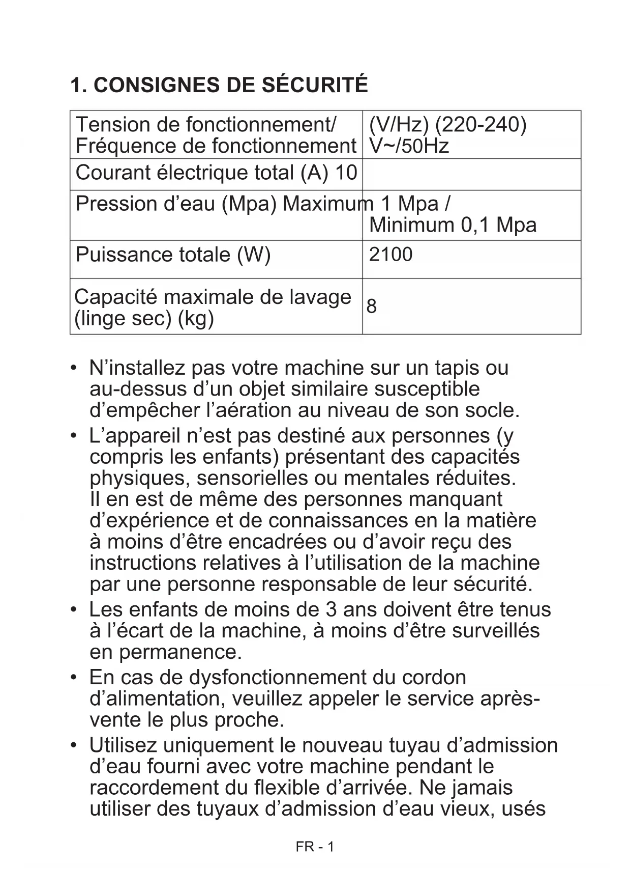- L’emballage de la machine peut être dangereux FR - 3pour les enfants. Ne laissez pas les enfants jouer avec l’emballage ou les petites pièces de la machine à laver.