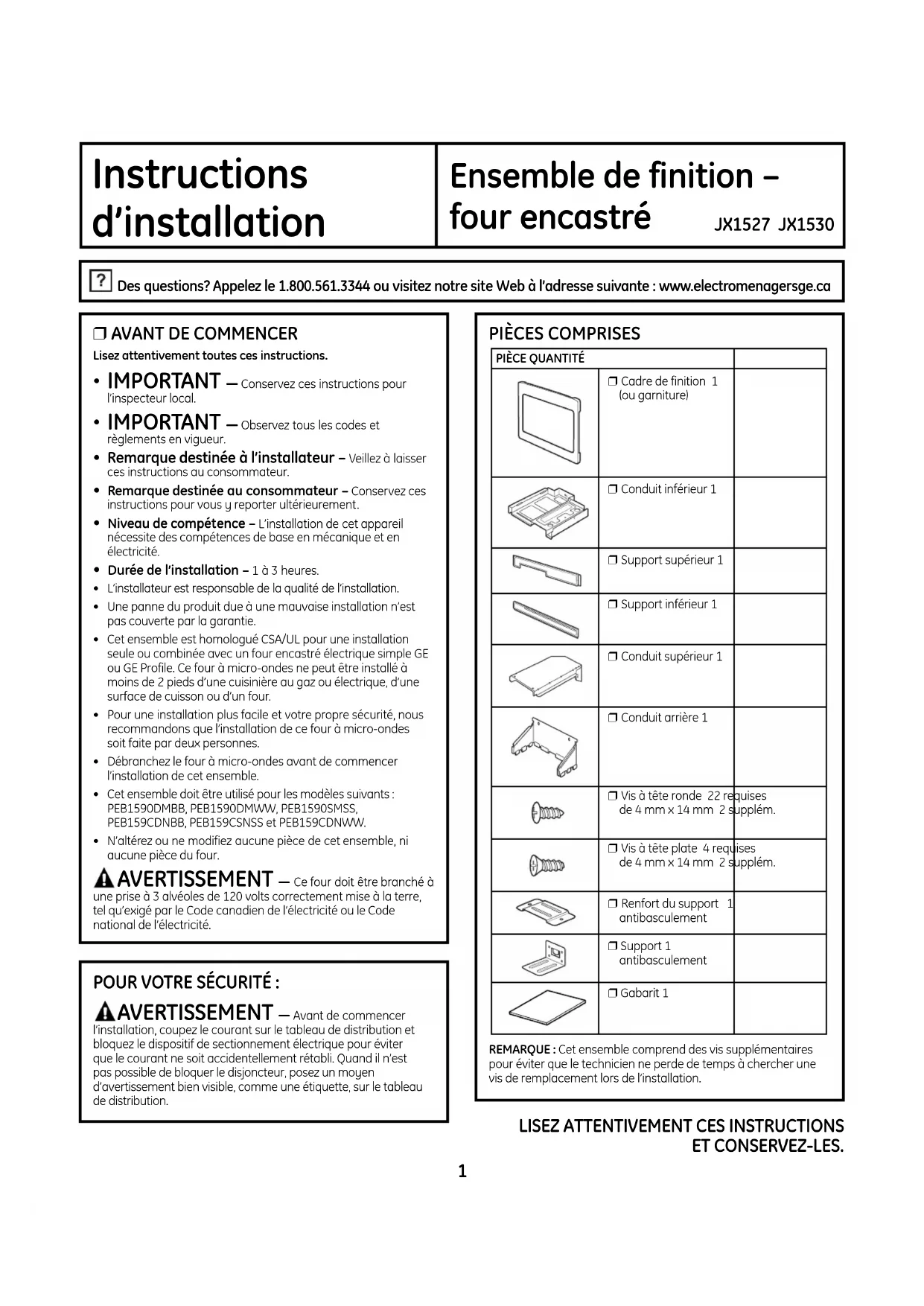 - N’altérez ou ne modifiez aucune pièce de cet ensemble, ni aucune pièce du four. AVERTISSEMENT — Ce four doit être branché à une prise à 3 alvéoles de 120 volts correctement mise à la terre,tel qu’exigé par le Code canadien de l’électricité ou le Codenational de l’électricité. POUR VOTRE SÉCURITÉ : AVERTISSEMENT — Avant de commencer l’installation, coupez le courant sur le tableau de distribution etbloquez le dispositif de sectionnement électrique pour éviter que le courant ne soit accidentellement rétabli. Quand il n’est pas possible de bloquer le disjoncteur, posez un moyend’avertissement bien visible, comme une étiquette, sur le tableaude distribution. Des questions? Appelez le 1.800.561.3344 ou visitez notre site Web à l’adresse suivante : www.electromenagersge.caOUTILS NÉCESSAIRES