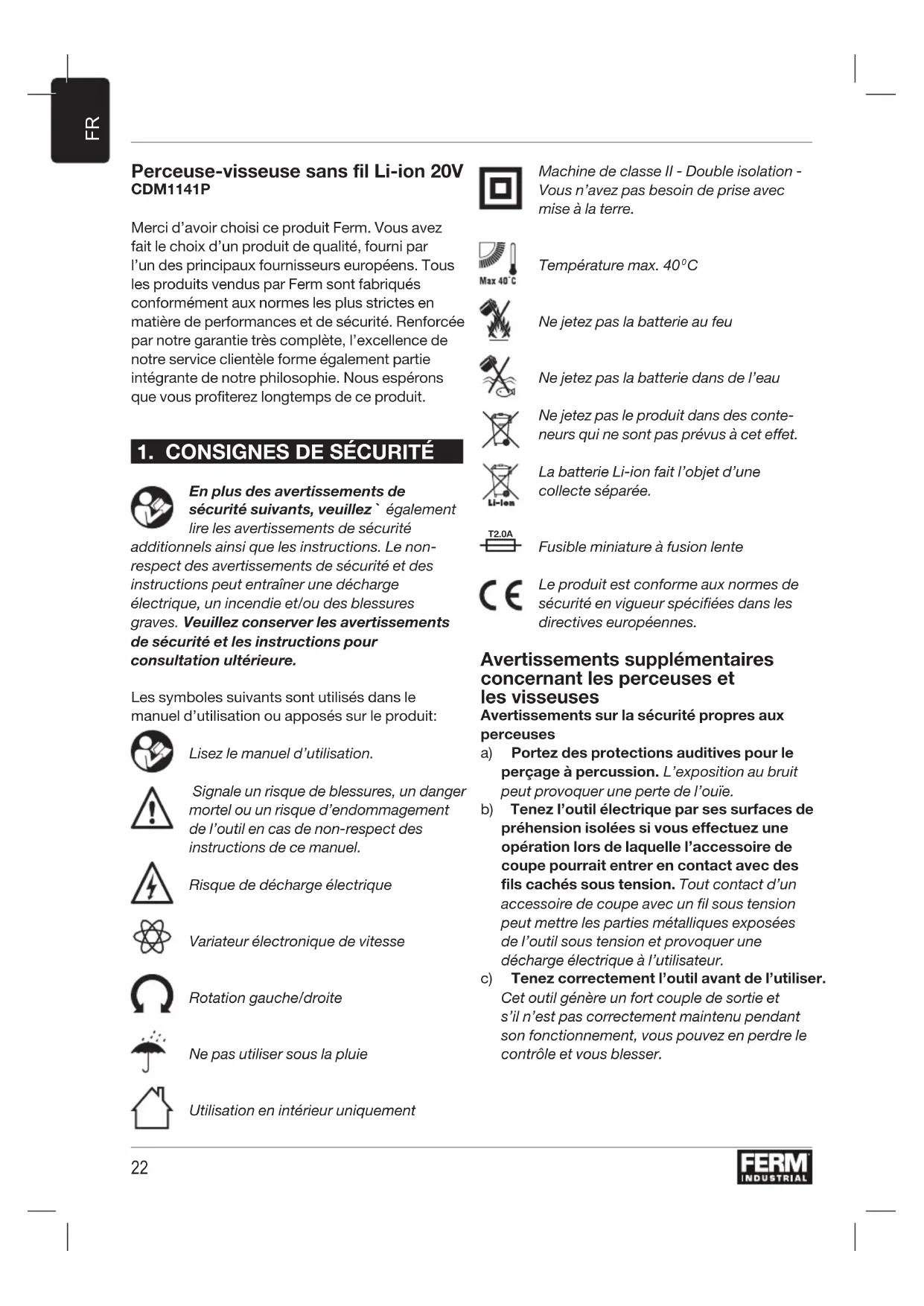 Perceuse-visseuse sans fil Li-ion 20V CDM1141P Merci d’avoir choisi ce produit Ferm. Vous avez fait le choix d’un produit de qualité, fourni par l’un des principaux fournisseurs européens. Tous les produits vendus par Ferm sont fabriqués conformément aux normes les plus strictes en matière de performances et de sécurité. Renforcée par notre garantie très complète, l’excellence de notre service clientèle forme également partie intégrante de notre philosophie. Nous espérons que vous profiterez longtemps de ce produit.