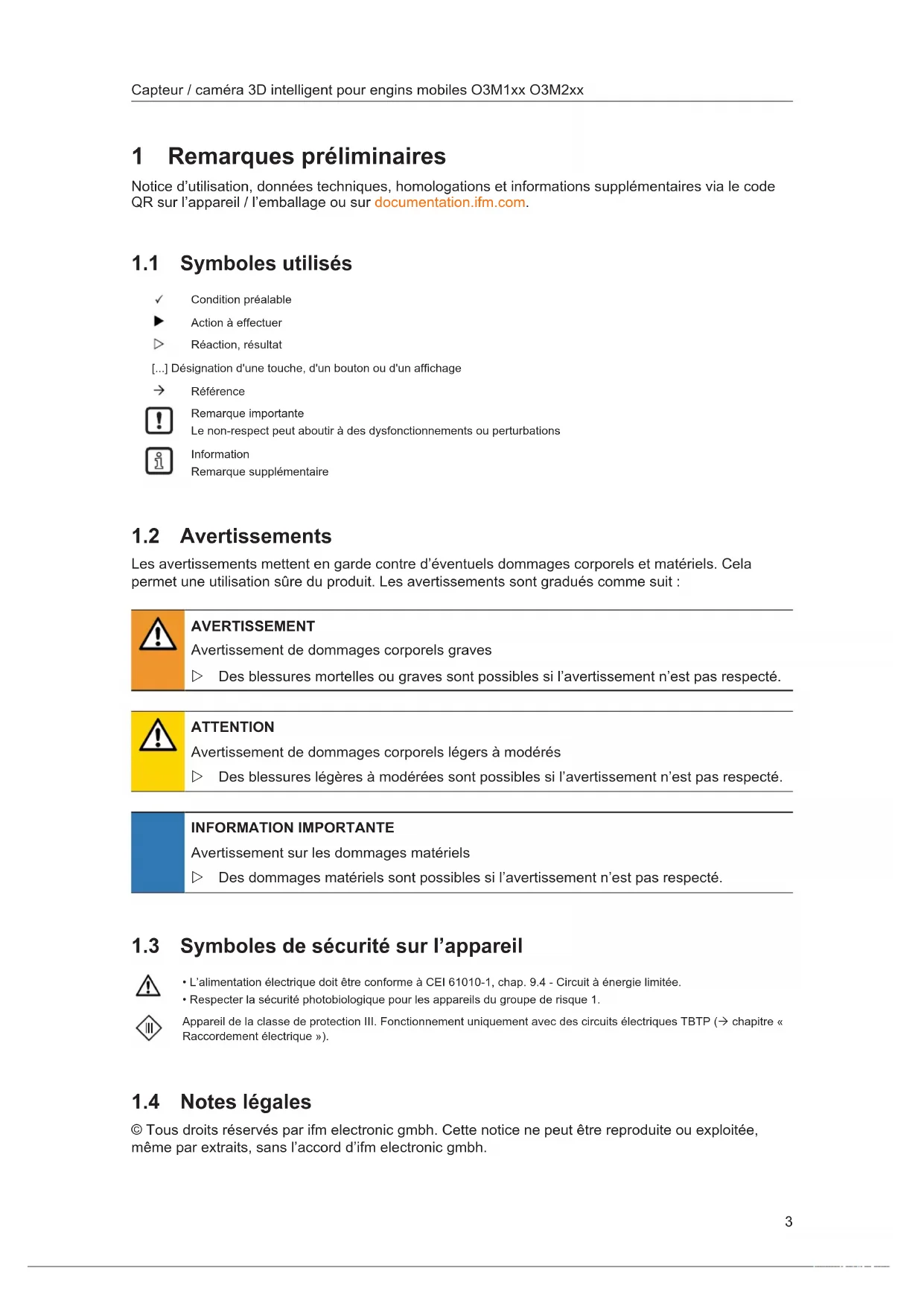 - Respecter la sécurité photobiologique pour les appareils du groupe de risque 1. Appareil de la classe de protection III. Fonctionnement uniquement avec des circuits électriques TBTP (Ò chapitre « Raccordement électrique »). 1.4 Notes légales © Tous droits réservés par ifm electronic gmbh. Cette notice ne peut être reproduite ou exploitée, même par extraits, sans l’accord d’ifm electronic gmbh.O3M1xx O3M2xx Capteur / caméra 3D intelligent pour engins mobiles
