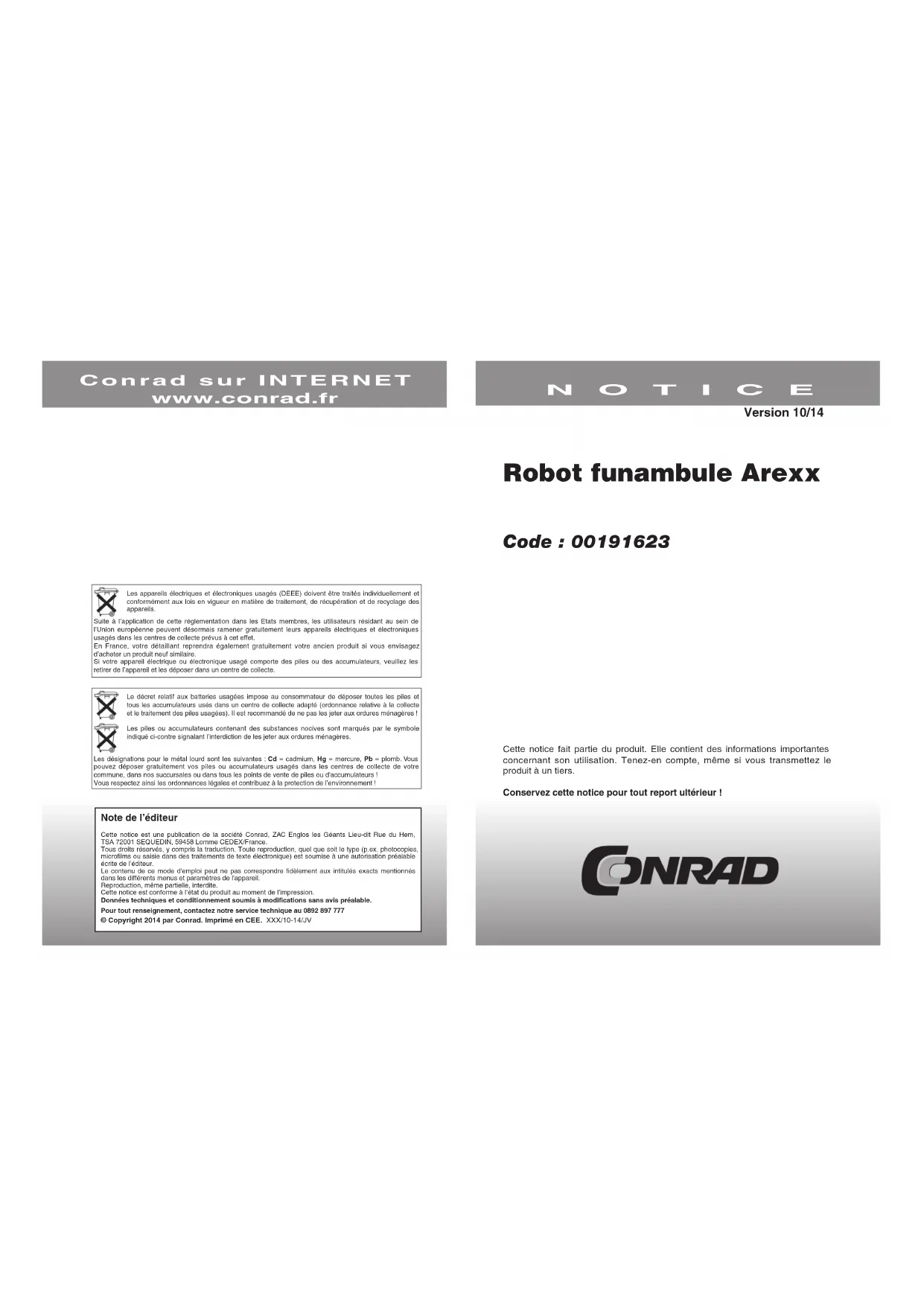 Robot funambule Arexx Code : 00191623 Cette notice fait partie du produit. Elle contient des informations importantes concernant son utilisation. Tenez-en compte, même si vous transmettez le produit à un tiers.Conservez cette notice pour tout report ultérieur ! NOTICE Conrad sur INTERNET www.conrad.fr Version 10/14 Note de l’éditeur Cette notice est une publication de la société Conrad, ZAC Englos les Géants Lieu-dit Rue du Hem, TSA 72001 SEQUEDIN, 59458 Lomme CEDEX/France.Tous droits réservés, y compris la traduction. Toute reproduction, quel que soit le type (p.ex. photocopies, microfilms ou saisie dans des traitements de texte électronique) est soumise à une autorisation préalable écrite de l’éditeur.Le contenu de ce mode d'emploi peut ne pas correspondre fidèlement aux intitulés exacts mentionnés dans les différents menus et paramètres de l'appareil.Reproduction, même partielle, interdite.Cette notice est conforme à l’état du produit au moment de l’impression.Données techniques et conditionnement soumis à modifications sans avis préalable.Pour tout renseignement, contactez notre service technique au 0892 897 777 © Copyright 2014 par Conrad. Imprimé en CEE. XXX/10-14/JVLes appareils électriques et électroniques usagés (DEEE) doivent être traités individuellement et conformément aux lois en vigueur en matière de traitement, de récupération et de recyclage des appareils.Suite à l’application de cette réglementation dans les Etats membres, les utilisateurs résidant au sein de l’Union européenne peuvent désormais ramener gratuitement leurs appareils électriques et électroniques usagés dans les centres de collecte prévus à cet effet.En France, votre détaillant reprendra également gratuitement votre ancien produit si vous envisagez d’acheter un produit neuf similaire.Si votre appareil électrique ou électronique usagé comporte des piles ou des accumulateurs, veuillez les retirer de l’appareil et les déposer dans un centre de collecte.Le décret relatif aux batteries usagées impose au consommateur de déposer toutes les piles et tous les accumulateurs usés dans un centre de collecte adapté (ordonnance relative à la collecte et le traitement des piles usagées). Il est recommandé de ne pas les jeter aux ordures ménagères !Les piles ou accumulateurs contenant des substances nocives sont marqués par le symbole indiqué ci-contre signalant l’interdiction de les jeter aux ordures ménagères. Les désignations pour le métal lourd sont les suivantes : Cd = cadmium, Hg = mercure, Pb = plomb. Vous pouvez déposer gratuitement vos piles ou accumulateurs usagés dans les centres de collecte de votre commune, dans nos succursales ou dans tous les points de vente de piles ou d'accumulateurs !Vous respectez ainsi les ordonnances légales et contribuez à la protection de l’environnement !2 15