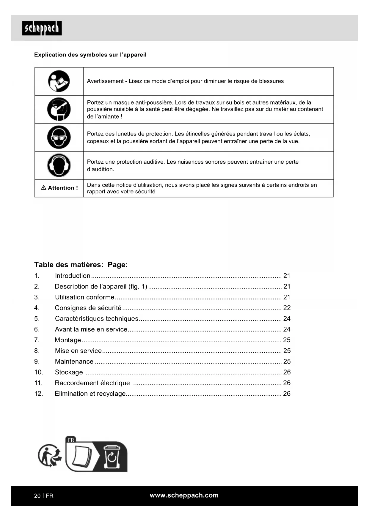 - Attention : Les consignes de sécurité suivantes doivent impérativement être respectées lors de l’utilisation d’outils électriques pour éviter les chocs électriques, les risques de blessures et incendies.www.scheppach.com