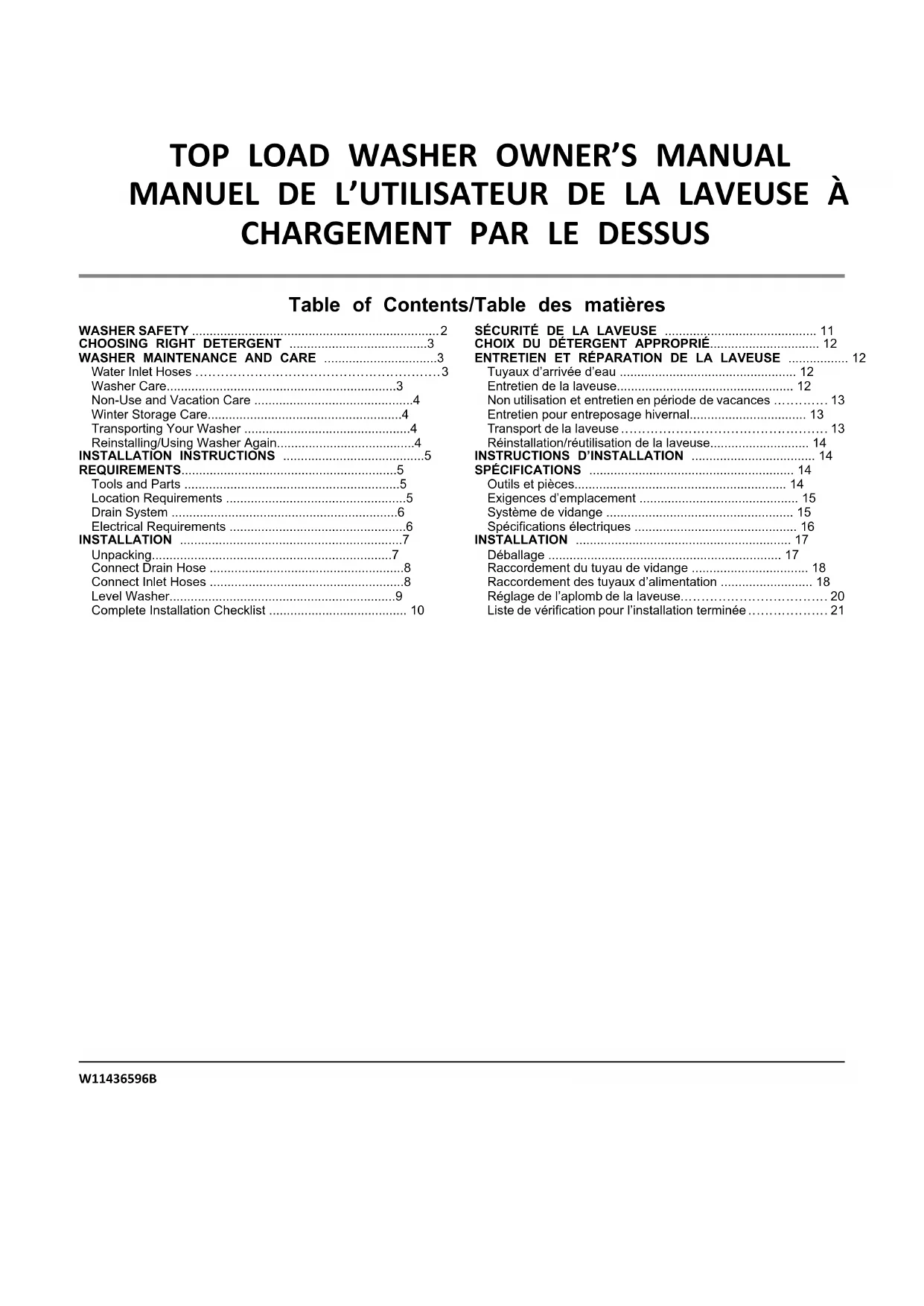 terreListe de vérification pour l’installation terminée ■ Consulter les spécifications électriques. S’assurer de disposer d’une source d’électricité appropriée, et d’une liaison à la terre conforme à la méthode recommandée. ■ Vérifier que toutes les pièces sont maintenant installées. S’il reste une pièce, passer en revue les différentes étapes pour découvrir laquelle aurait été oubliée. ■ Vérifier la présence de tous les outils. ■ Vérifier que tout le matériel d’expédition a été retiré de la laveuse. ■ Vérifier que la laveuse est de niveau. ■ Vérifier que les robinets d’eau sont ouverts. ■ Vérifier qu’il n’y a pas de fuite autour des robinets et des tuyaux d’arrivée d’eau. ■ Ôter la pellicule protectrice de la console et tout ruban adhésif resté sur la laveuse. ■ Vérifier que la laveuse est branchée sur une prise de courant à 3 alvéoles reliée à la terre. ■ Éliminer/recycler tous les matériaux d’emballage. ■ Lire la section « Entretien et réparation de la laveuse ». ■ Pour tester et nettoyer la laveuse, mesurer la moitié de la quantité normale recommandée de détergent en poudre ou liquide HE et la verser dans le panier de la laveuse ou le distributeur de détergent (sur certains modèles). Fermer le couvercle. Sélectionner n’importe quel programme. Mettre la laveuse en marche et la laisser exécuter un programme complet. 21NOTESNOTESW11436596B ©2023 All rights reserved. Used under license in Canada. Tous droits réservés. Utilisé sous licence au Canada. 07/23