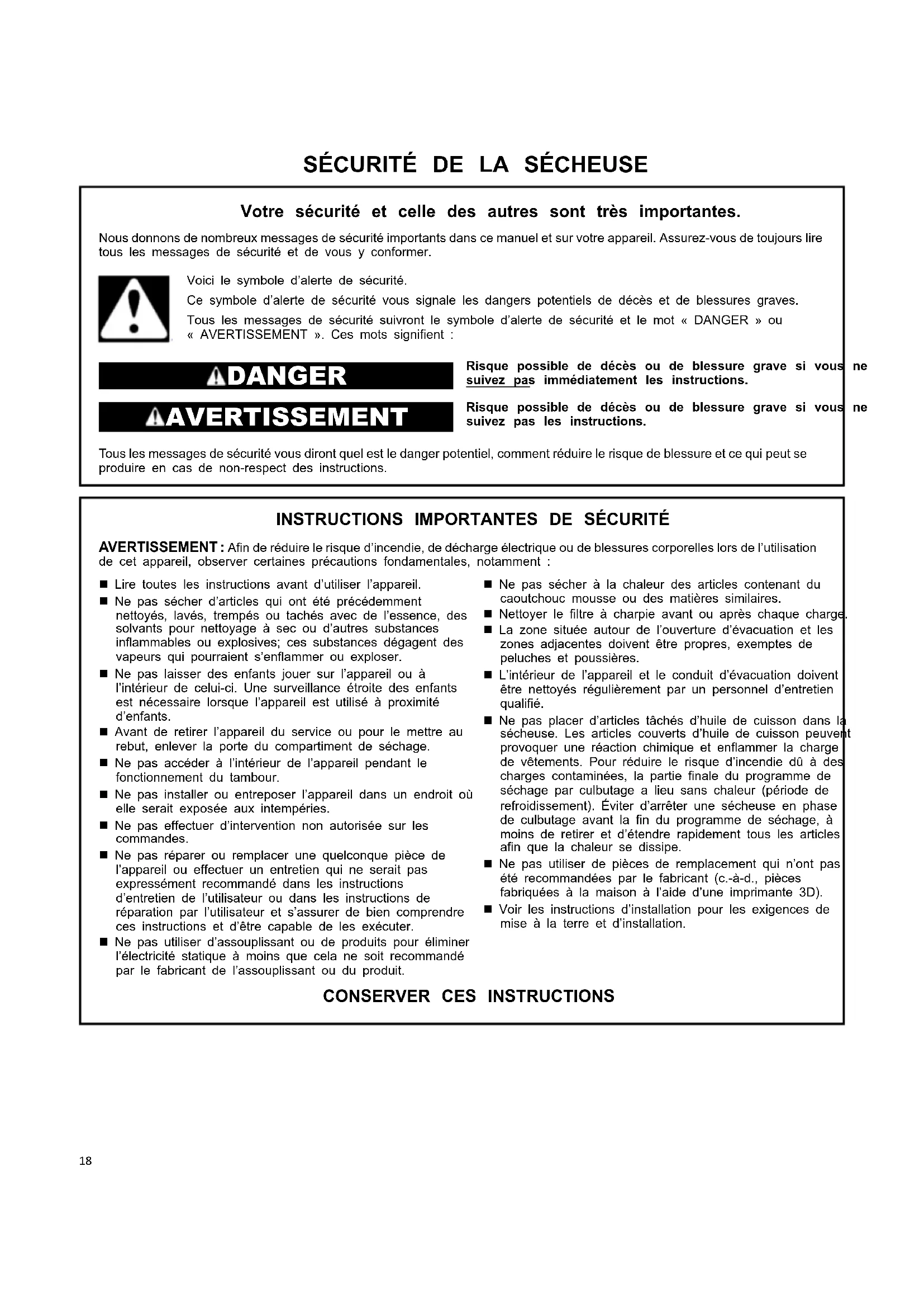 AVERTISSEMENT : Afin de réduire le risque d’incendie, de décharge électrique ou de blessures corporelles lors de l’utilisation de cet appareil, observer certaines précautions fondamentales, notamment : Lire toutes les instructions avant d’utiliser l’appareil. Ne pas sécher d’articles qui ont été précédemment nettoyés, lavés, trempés ou tachés avec de l’essence, des solvants pour nettoyage à sec ou d’autres substances inflammables ou explosives; ces substances dégagent des vapeurs qui pourraient s’enflammer ou exploser. Ne pas laisser des enfants jouer sur l’appareil ou à l’intérieur de celui-ci. Une surveillance étroite des enfants est nécessaire lorsque l’appareil est utilisé à proximité d’enfants. Avant de retirer l’appareil du service ou pour le mettre au rebut, enlever la porte du compartiment de séchage. Ne pas accéder à l’intérieur de l’appareil pendant le fonctionnement du tambour. Ne pas installer ou entreposer l’appareil dans un endroit où elle serait exposée aux intempéries. Ne pas effectuer d’intervention non autorisée sur les commandes. Ne pas réparer ou remplacer une quelconque pièce de l’appareil ou effectuer un entretien qui ne serait pas expressément recommandé dans les instructions d’entretien de l’utilisateur ou dans les instructions de réparation par l’utilisateur et s’assurer de bien comprendre ces instructions et d’être capable de les exécuter. Ne pas utiliser d’assouplissant ou de produits pour éliminer l’électricité statique à moins que cela ne soit recommandé par le fabricant de l’assouplissant ou du produit. Ne pas sécher à la chaleur des articles contenant du caoutchouc mousse ou des matières similaires. Nettoyer le filtre à charpie avant ou après chaque charge. La zone située autour de l’ouverture d’évacuation et les zones adjacentes doivent être propres, exemptes de peluches et poussières. L’intérieur de l’appareil et le conduit d’évacuation doivent être nettoyés régulièrement par un personnel d’entretien qualifié. Ne pas placer d’articles tâchés d’huile de cuisson dans la sécheuse. Les articles couverts d’huile de cuisson peuvent provoquer une réaction chimique et enflammer la charge de vêtements. Pour réduire le risque d’incendie dû à des charges contaminées, la partie finale du programme de séchage par culbutage a lieu sans chaleur (période de refroidissement). Éviter d’arrêter une sécheuse en phase de culbutage avant la fin du programme de séchage, à moins de retirer et d’étendre rapidement tous les articles afin que la chaleur se dissipe. Ne pas utiliser de pièces de remplacement qui n’ont pas été recommandées par le fabricant (c.-à-d., pièces fabriquées à la maison à l’aide d’une imprimante 3D). Voir les instructions d’installation pour les exigences de mise à la terre et d’installation.