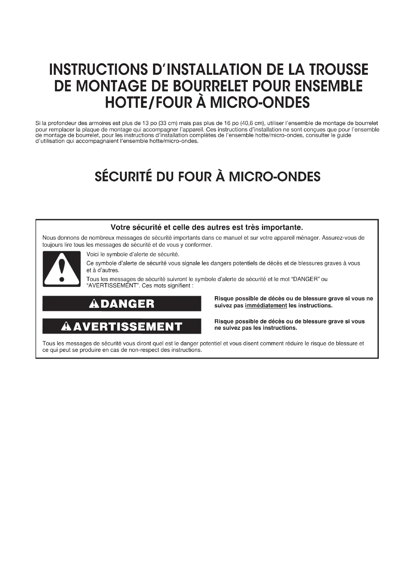 Instruction d’installation de l’ensemble de montage de bourrelet Instructions d’installation 1 Conserver la plaque de montage et le gabarit en carton fournis avec le four à micro-ondes pour une utilisation future si nécessaire. Exigences d’emplacement Inspecter l’ouverture où le four à micro-ondes sera installé. L’emplacement doit comporter les caractéristiques suivantes: ■ Dimensions minimales à respecter lors de l’installation. Voir l’illustration « Dimensions à respecter lors de l’installation ». ■ Au moins un montant en bois 2po x 4po (51 x 102mm), et parement de plâtre/support d’enduit ou panneau de gypse d’épaisseur 3/8 po (10mm) ou plus, dans l’ouverture de l’armoire. ■ Capacité de support de charge de 150lb (68kg), ceci inclut le four à micro-ondes et les articles placés à l’intérieur du four à micro-ondes et de l’armoire supérieure. ■ Prise de courant électrique reliée à la terre à l’intérieur de l’armoire supérieure. Voir la section « Spécications électriques ». REMARQUE: Les matériaux de certaines armoires et certains matériaux de construction peuvent ne pas résister à la chaleur émise par le four à micro-ondes lors des opérations de cuisson. Consulter le constructeur de la maison ou le fabricant des armoires pour déterminer si les matériaux utilisés pourraient subir un changement de couleur, une déstratication ou d’autres dommages. Exigences particulières Pour une installation avec décharge murale seulement: ■ L’ouverture découpée doit être exempte d’obstruction pour l’ajustement adéquat du conduit d’évacuation et pour que la plaque du registre puisse s’ouvrir complètement et librement. Pour une installation avec décharge à l’extérieur à travers le toit seulement: ■ Si on utilise un raccord de transition rectangulaire/rond, on doit disposer d’un espace libre de 3po (76mm) au-dessus du four à micro-ondes an que la plaque du registre puisse s’ouvrir complètement et librement. Voir l’illustration « Raccord de transition rectangulaire/rond » dans la section « Spécications/conception du circuit d’évacuation » du guide d’utilisation du produit.15 Dimensions d’installation REMARQUE: La prise de courant à 3 alvéoles reliée à la terre doit être située à l’intérieur de l’armoire supérieure. Voir la section « Exigences électriques » du guide d’utilisation sur le produit. Dimensions du produit