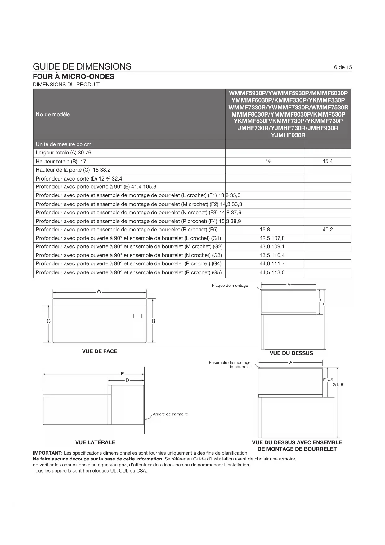 7 de 15 IMPORTANT: Les spécications dimensionnelles sont fournies uniquement à des ns de planication. Ne faire aucune découpe sur la base de cette information. Se référer au Guide d’installation avant de choisir une armoire, de vérier les connexions électriques/au gaz, d’effectuer des découpes ou de commencer l’installation.Tous les appareils sont homologués UL, CUL ou CSA. FOUR À MICRO-ONDES No de modèle WMMF5930P/YWMMF5930P/MMMF6030P/YMMMF6030P KMMF330P/YKMMF330P/WMMF7330R/YWMMF7330R WMMF7530R/MMMF8030P/YMMMF8030P/KMMF530P YKMMF530P/KMMF730P/YKMMF730P/JMHF730R