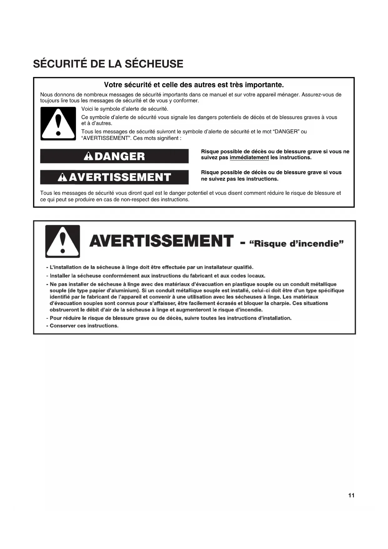 AVERTISSEMENT : Afin de réduire le risque d’incendie, de décharge électrique ou de blessures lors de l’utilisation de la sécheuse, il convient d’observer certaines précautions fondamentales, notamment: