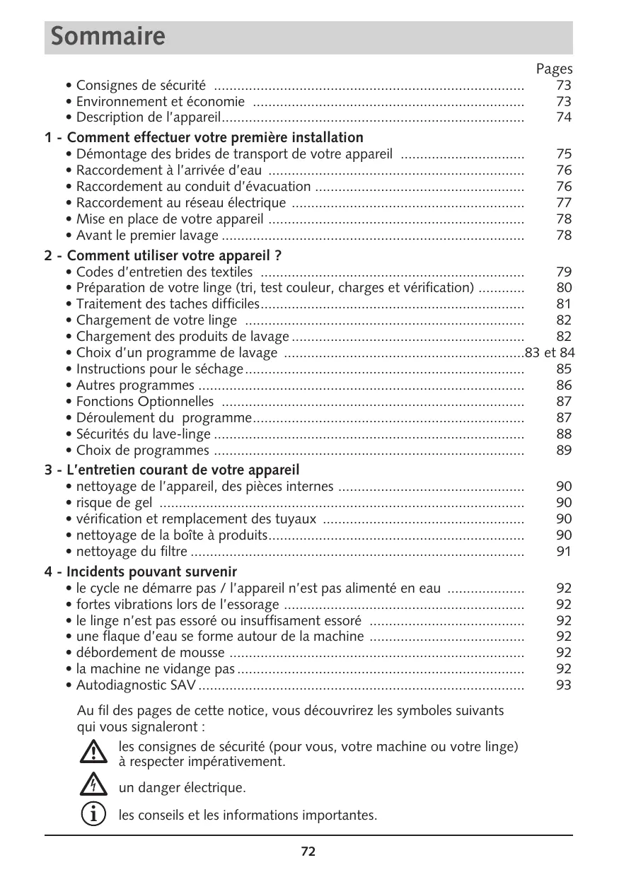 | Entretien et nettoyage | Nettoyage du filtre à peluches, entretien du joint de porte |