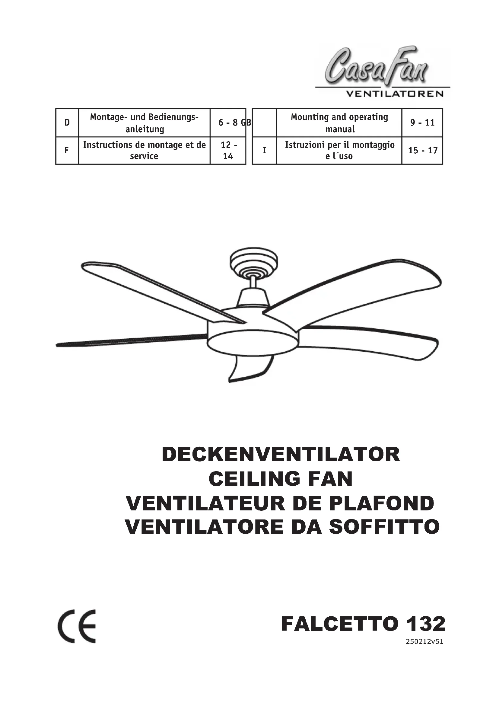 Conseils en vue de remédier aux incidents Incident Remède Le ventilateur ne se met pas en marche. Vérifiez les fusibles du secteur et les autres connexions. Vérifiez si le ventilateur est correctement connecté au secteur. ss. Vérifiez si les fusibles dans la boîte de raccordement sont correctement posés. Le ventilateur émet des bruits. Vérifiez si toutes les vis sont correctement serrées. Laissez au ventilateur et aux roulements une période de rodage de 24 heures. La plupart des bruits disparaissent après ce lapse de temps. Le ventilateur vibre trop Toutes les pales ont été pesées et groupées en fonction de leur poids. La densité peut varier et provoquer des vibrations même si toutes les pales présentent le même poids. La méthode suivante peut contribuer à empêcher la plupart des vibrations. Vérifier les vibrations après chaque opération. Veuillez vérifier si les petites vibrations sont normales et ne posent pas de problème. Les vibrations surviennent généralement lors que les pales ne sont plus alignées entre elles. L’alignement des pales peut être facilement constaté à l’aide d’une règle plate. Placez la règle à la verticale du plafond et de l’extrémité de la pale. Marquer la distance entre le côté de la pale et le plafond. Tournez les pales lentement à la main et effectuez les mêmes mesures sur les autres pales. Si l’une des pales n’est par correctement orientée, veuillez corriger ce défaut en poussant les supports vers le bas ou vers le bas afin des orienter dans l’alignement des autres. Vérifiez si la plaque de montage est correctement ancrée dans le plafond. Attention : L’ouverture de l’appareil et les réparations sont l’affaire exclusive d’un spécialiste !15 Sulle istruzioni per l’uso Prima di utilizzare il ventilatore CasaFan, leggete con attenzione le relative istruzioni e con- servatele a portata di mano. In caso di trasferimento del ventilatore a terzi, accludete sempre le relative istruzioni per l’uso. Significato dei simboli: Pericolo tensione elettrica Attenzione Avverte l’utente del rischio di danno provo- cato da tensione elettrica. Avvertenza per l’utente.