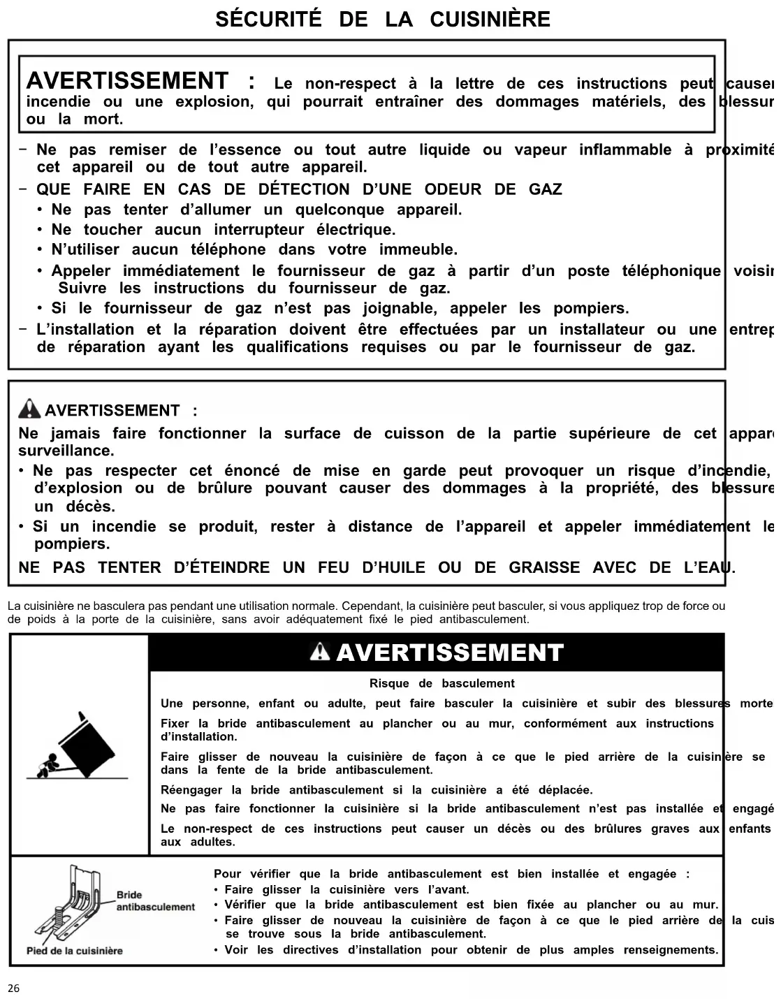 - Si un incendie se produit, rester à distance de l’appareil et appeler immédiatement les pompiers. NE PAS TENTER D’ÉTEINDRE UN FEU D’HUILE OU DE GRAISSE AVEC DE L’EAU. La cuisinière ne basculera pas pendant une utilisation normale. Cependant, la cuisinière peut basculer, si vous appliquez trop de force ou de poids à la porte de la cuisinière, sans avoir adéquatement fixé le pied antibasculement. AVERTISSEMENT Risque de basculement Une personne, enfant ou adulte, peut faire basculer la cuisinière et subir des blessures mortelles. Fixer la bride antibasculement au plancher ou au mur, conformément aux instructions d’installation. Faire glisser de nouveau la cuisinière de façon à ce que le pied arrière de la cuisinière se trouve dans la fente de la bride antibasculement. Réengager la bride antibasculement si la cuisinière a été déplacée. Ne pas faire fonctionner la cuisinière si la bride antibasculement n’est pas installée et engagée. Le non-respect de ces instructions peut causer un décès ou des brûlures graves aux enfants et aux adultes. Pour vérifier que la bride antibasculement est bien installée et engagée :