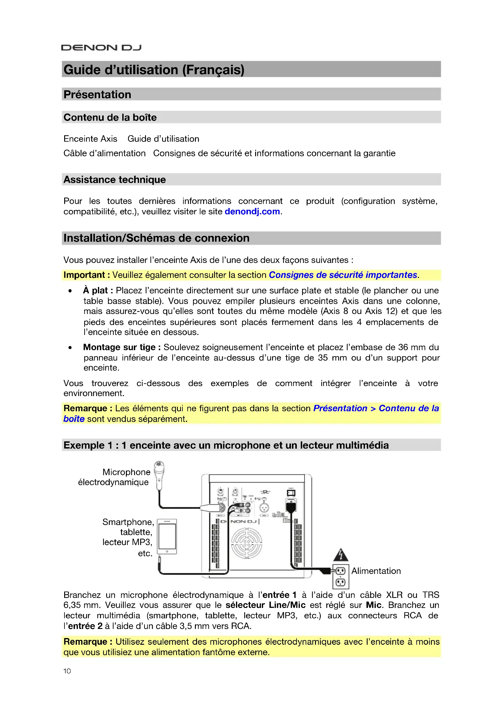 Guide d’utilisation (Français) Présentation Contenu de la boîte Enceinte Axis Guide d’utilisation Câble d’alimentation Consignes de sécurité et informations concernant la garantie Assistance technique Pour les toutes dernières informations concernant ce produit (configuration système, compatibilité, etc.), veuillez visiter le site denondj.com. Installation/Schémas de connexion Vous pouvez installer l’enceinte Axis de l’une des deux façons suivantes : Important : Veuillez également consulter la section Consignes de sécurité importantes.