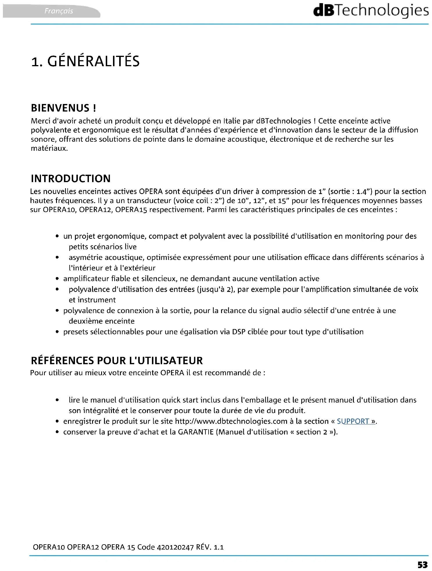 - REMARQUE POUR L’INSTALLATEUR : Les valeurs se réfèrent à 1/8 de la puissance, dans des conditions moyennes de fonctionnement (programmede musique avec clipping rare ou absent). Il est conseillé pour tout type de conguration de considérer les valeurs minimales de dimensionnement. INTERFACE UTILISATEUR Commandes : Contrôle niveaux, sélecteur ground lift, commande rotative DSP preset à 8 positions67 OPERA10 OPERA12 OPERA 15 Code 420120247 RÉV. 1.1 DIMENSIONS Matériau : Polypropylène PP renforcé Grille : Pré-équipé pour y-bar : Acier peint / usinage CNC Oui Largeur : Poignées : Profondeur : Hauteur : Installation sur poteau : Poids : 1 supérieure / 1 inférieure avec interface IR Oui, 36 mm Les caractéristiques, les spécications et l'aspect des produits sont sujets à changement sans préavis. dBTechnologies se réserve le droit d'apporter des modications ou des améliorations de design ou de fabrication, sans obligation de modier ou d'améliorer également les produits déjà réalisés. A.E.B. Industriale Srl Via Brodolini, 8 Località Crespellano 40053 VALSAMOGGIA BOLOGNE (ITALIE) Tél. +39 051 969870 Fax +39 051 969725 www.dbtechnologies.com info@dbtechnologies-aeb.com Français 300 mm (OPERA10) 349 mm (OPERA12) 420 mm (OPERA15) 301 mm (OPERA10) 350 mm (OPERA12) 419 mm (OPERA15) 552 mm (OPERA10) 642 mm (OPERA12) 722 mm (OPERA15) 12,3 kg (OPERA10) 14,3 kg (OPERA12) 18,3 kg (OPERA15)68 OPERA10 OPERA12 OPERA 15 Cód. 420120247 REV. 1.1 ÍNDICE Español ÍNDICE 1. INFORMACIÓN GENERAL .................................................................................................... 69 ¡BIENVENIDOS! ................................................................................................................ 69 INTRODUCCIÓN ................................................................................................................ 69
