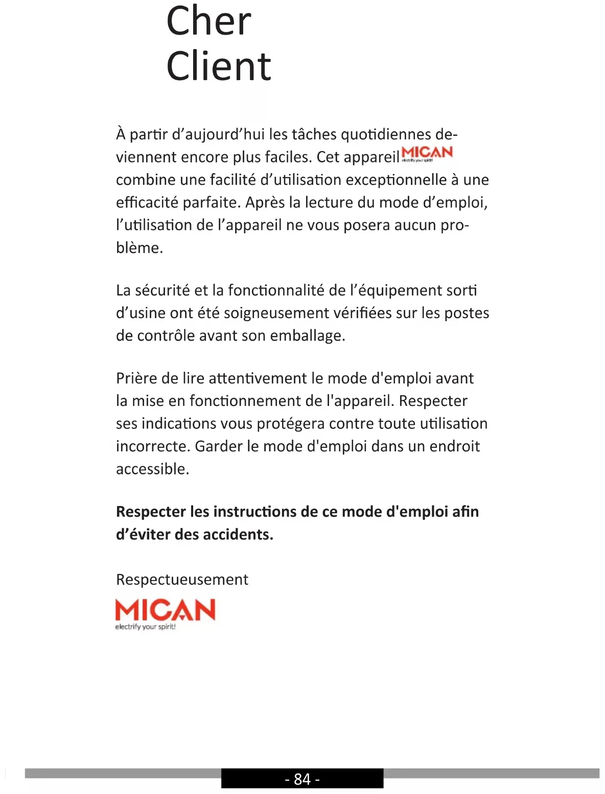 - Smernica RoHS 2011/65/EU Zariadenie je označené symbolom a má vyhlásenie o zhode na kontrolu príslušným orgánom dohľadu nad trhom.- 84 - Cher Client À parr d’aujourd’hui les tâches quodiennes de- viennent encore plus faciles. Cet appareil combine une facilité d’ulisaon exceponnelle à une ecacité parfaite. Après la lecture du mode d’emploi, l’ulisaon de l’appareil ne vous posera aucun pro- blème. La sécurité et la fonconnalité de l’équipement sor d’usine ont été soigneusement vériées sur les postes de contrôle avant son emballage. Prière de lire aenvement le mode d'emploi avant la mise en fonconnement de l'appareil. Respecter ses indicaons vous protégera contre toute ulisaon incorrecte. Garder le mode d'emploi dans un endroit accessible. Respecter les instrucons de ce mode d'emploi an d’éviter des accidents. Respectueusement- 85 -