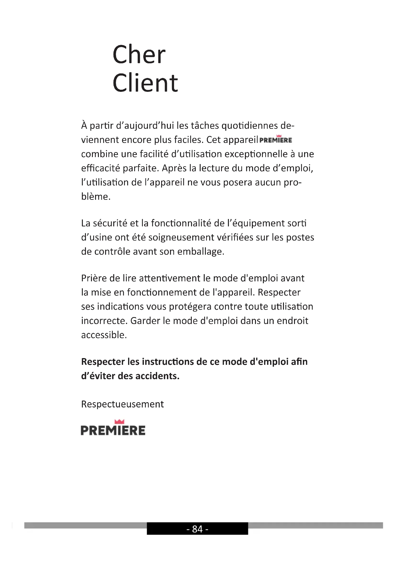 - Smernica RoHS 2011/65/EU Zariadenie je označené symbolom a má vyhlásenie o zhode na kontrolu príslušným orgánom dohľadu nad trhom.- 84 - Cher Client À parr d’aujourd’hui les tâches quodiennes de- viennent encore plus faciles. Cet appareil combine une facilité d’ulisaon exceponnelle à une ecacité parfaite. Après la lecture du mode d’emploi, l’ulisaon de l’appareil ne vous posera aucun pro- blème. La sécurité et la fonconnalité de l’équipement sor d’usine ont été soigneusement vériées sur les postes de contrôle avant son emballage. Prière de lire aenvement le mode d'emploi avant la mise en fonconnement de l'appareil. Respecter ses indicaons vous protégera contre toute ulisaon incorrecte. Garder le mode d'emploi dans un endroit accessible. Respecter les instrucons de ce mode d'emploi an d’éviter des accidents. Respectueusement- 85 -