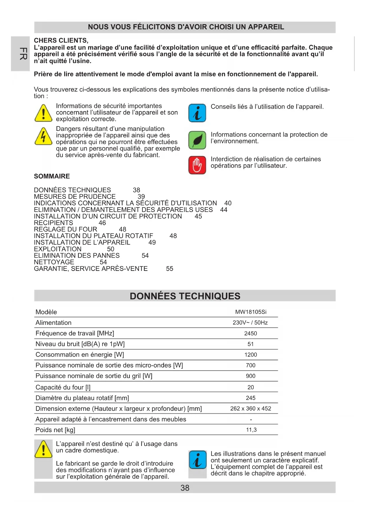 SOMMAIREDONNÉES TECHNIQUES 38MESURES DE PRUDENCE 39INDICATIONS CONCERNANT LA SÉCURITÉ D'UTILISATION 40ELIMINATION / DEMANTELEMENT DES APPAREILS USES 44INSTALLATION D’UN CIRCUIT DE PROTECTION 45RECIPIENTS 46REGLAGE DU FOUR 48INSTALLATION DU PLATEAU ROTATIF 48INSTALLATION DE L’APPAREIL 49EXPLOITATION 50ELIMINATION DES PANNES 54NETTOYAGE 54GARANTIE, SERVICE APRÈS-VENTE 55 ModèleMW18105SiAlimentation230V~ / 50HzFréquence de travail [MHz] Niveau du bruit [dB(A) re 1pW] Consommation en énergie [W] Puissance nominale de sortie des micro-ondes [W] Puissance nominale de sortie du gril [W] Capacité du four [l] Diamètre du plateau rotatif [mm] Dimension externe (Hauteur x largeur x profondeur) [mm]262 x 360 x 452Appareil adapté à l’encastrement dans des meubles Poids net [kg] 11,339