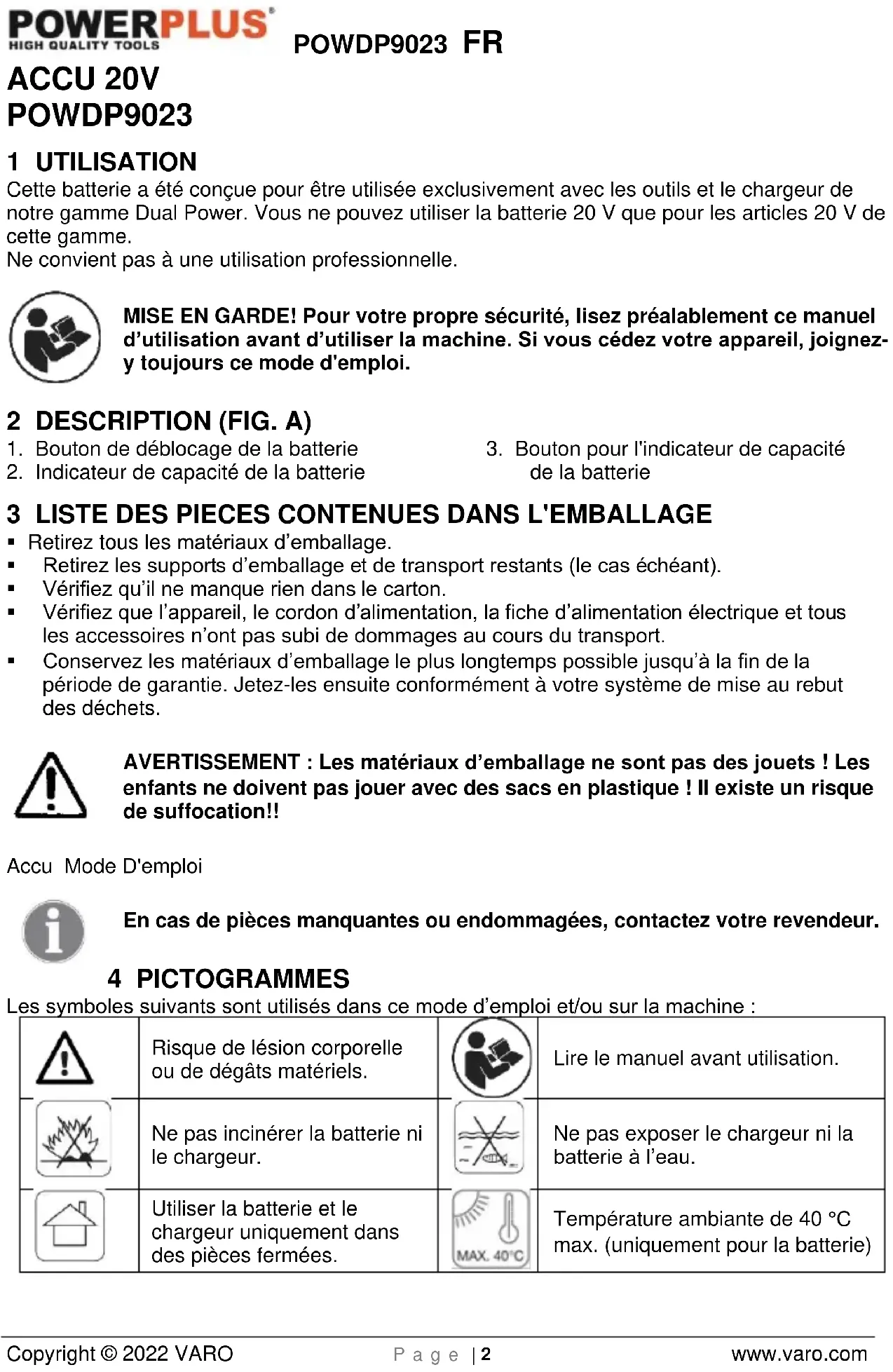 Copyright © 2022 VARO P a g e | 2 www.varo.com ACCU 20V POWDP9023 1 UTILISATION Cette batterie a été conçue pour être utilisée exclusivement avec les outils et le chargeur de notre gamme Dual Power. Vous ne pouvez utiliser la batterie 20 V que pour les articles 20 V de cette gamme. Ne convient pas à une utilisation professionnelle. MISE EN GARDE! Pour votre propre sécurité, lisez préalablement ce manuel d’utilisation avant d’utiliser la machine. Si vous cédez votre appareil, joignez- y toujours ce mode d'emploi. 2 DESCRIPTION (FIG. A)