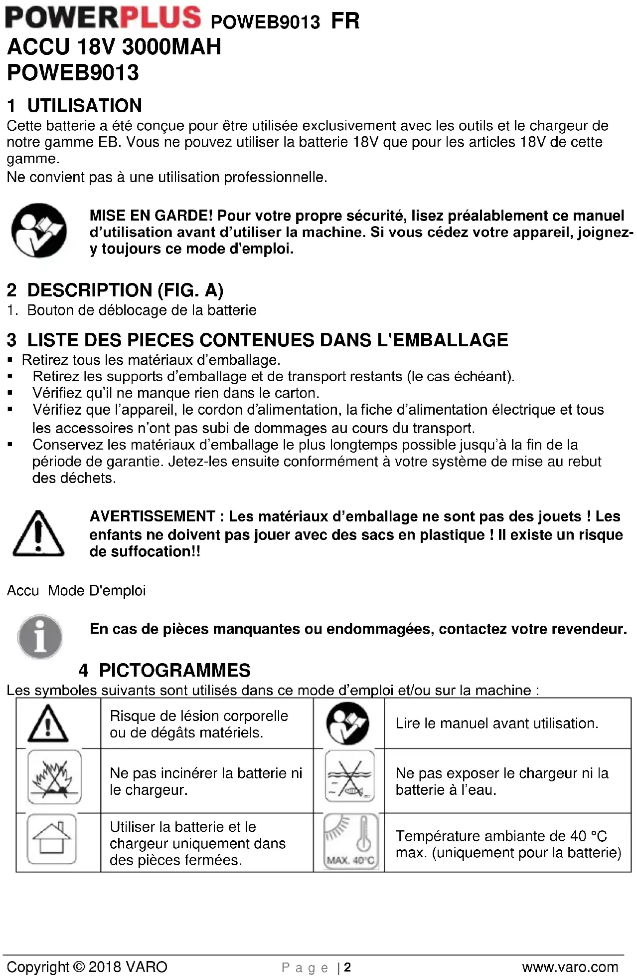 Température ambiante de 40 °C max. (uniquement pour la batterie)POWEB9013 FR Copyright © 2018 VARO P a g e | 3 www.varo.com 5 CONSIGNES DE SÉCURITÉ GÉNÉRALES Attention, toutes les instructions doivent être consultées ! Un non-respect des instructions et mises en garde suivantes peut entraîner des décharges électriques, des incendies et/ou des blessures graves. Conservez toutes les instructions et mises en garde pour une consultation ultérieure. La notion d'outil électrique" utilisée ci-après fait référence à un outil électrique connecté au réseau électrique (avec câble secteur) ou à un outil électrique alimenté par batterie (sans fil).