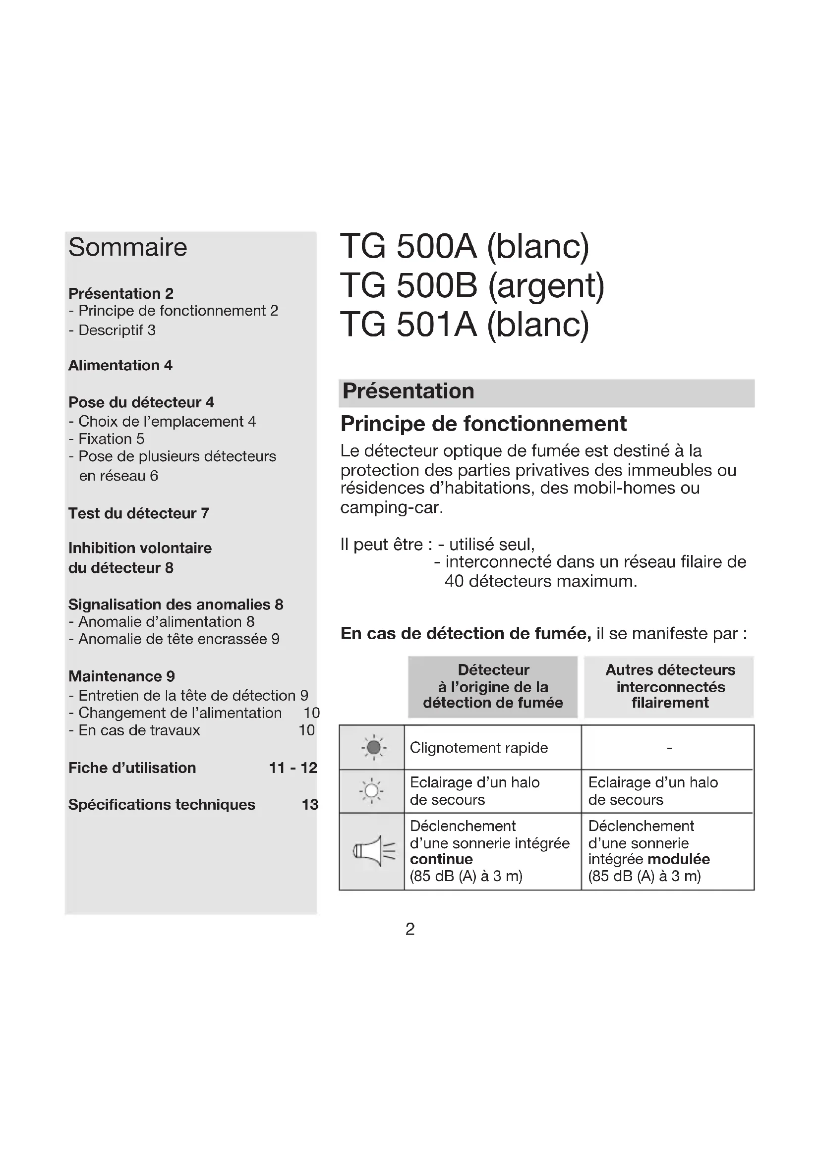 Sommaire Présentation 2 - Principe de fonctionnement 2 - Descriptif 3 Alimentation 4 Pose du détecteur 4 - Choix de l’emplacement 4 - Fixation 5 - Pose de plusieurs détecteurs en réseau 6 Test du détecteur 7 Inhibition volontaire du détecteur 8 Signalisation des anomalies 8 - Anomalie d’alimentation 8 - Anomalie de tête encrassée 9 Maintenance 9 - Entretien de la tête de détection 9 - Changement de l’alimentation 10 - En cas de travaux 10 Fiche d’utilisation 11 - 12 Spécifications techniques 13 TG 500A (blanc) TG 500B (argent) TG 501A (blanc) Principe de fonctionnement Le détecteur optique de fumée est destiné à la protection des parties privatives des immeubles ou résidences d’habitations, des mobil-homes ou camping-car. Il peut être : - utilisé seul, - interconnecté dans un réseau filaire de 40 détecteurs maximum. En cas de détection de fumée, il se manifeste par : Présentation3