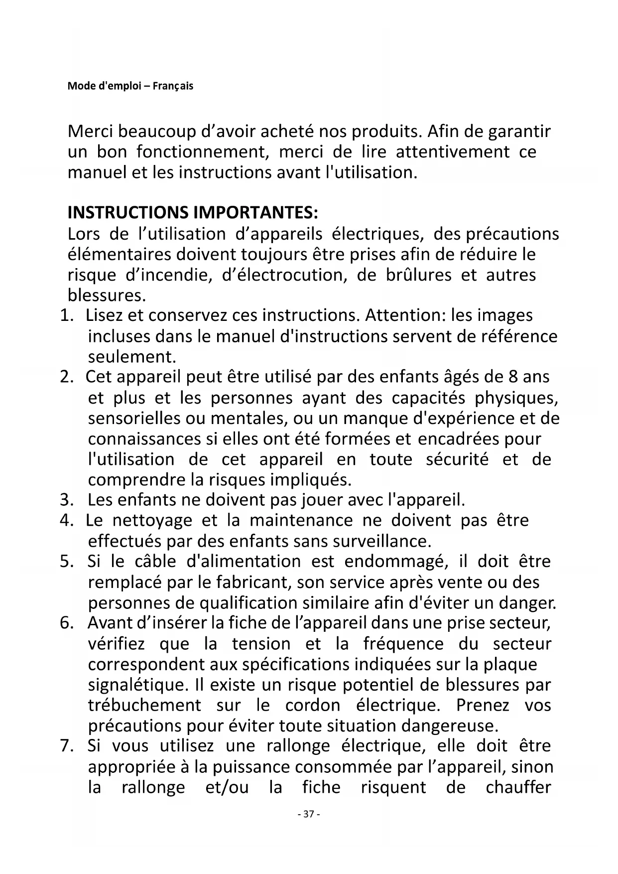 appropriée à la puissance consommée par l’appareil, sinon la rallonge et/ou la fiche risquent de chauffer- 38 - excessivement. Il existe un risque potentiel de blessures par trébuchement sur le cordon électrique. Prenez vos précautions pour éviter toute situation dangereuse.