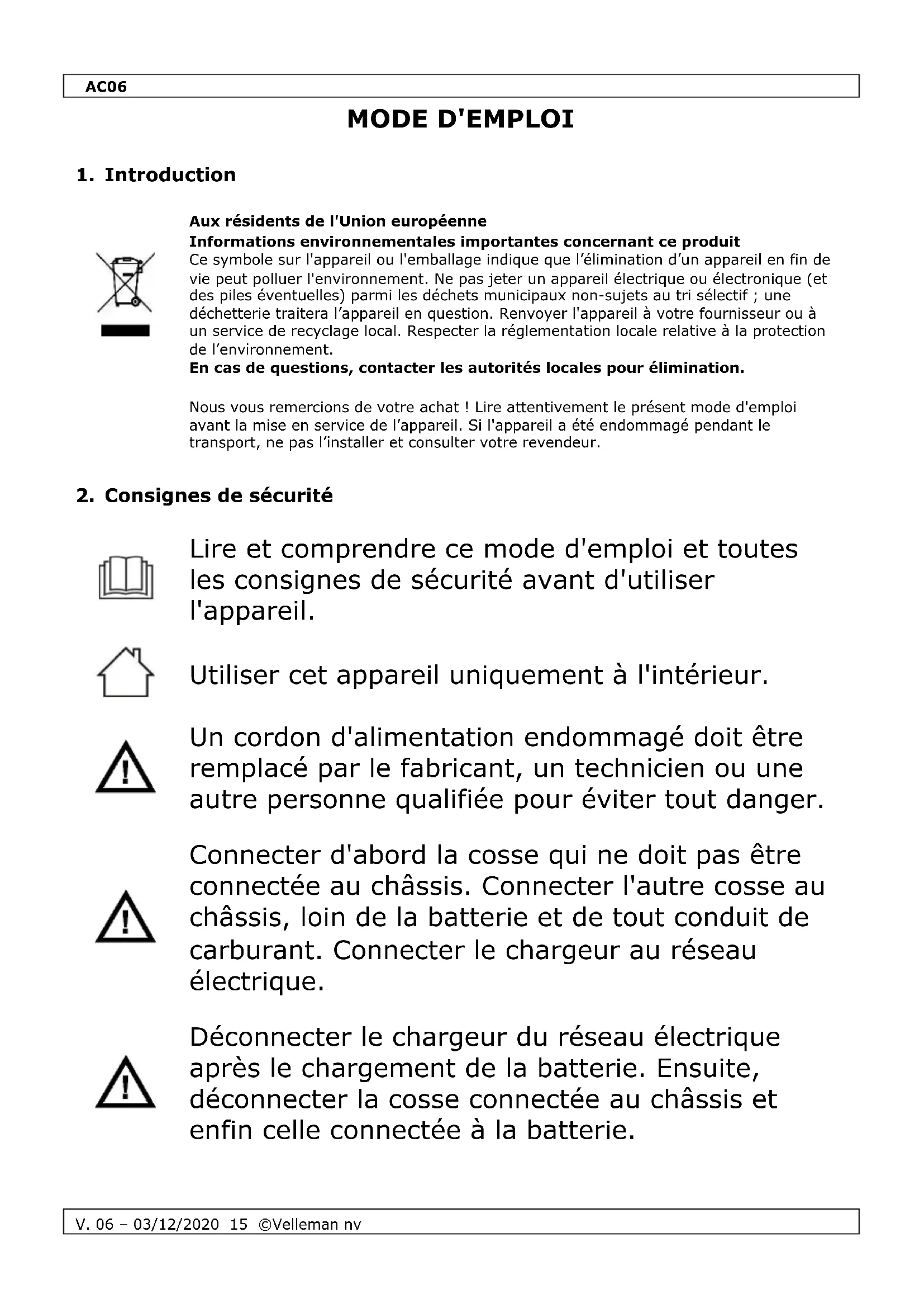 Velleman SA est l’ayant droit des droits d’auteur de ce mode d'emploi. Tous droits mondiaux réservés. Toute reproduction, traduction, copie ou diffusion, intégrale ou partielle, du contenu de ce mode d'emploi par quelque procédé ou sur tout support électronique que ce soit est interdite sans l’accord préalable écrit de l’ayant droit.AC06