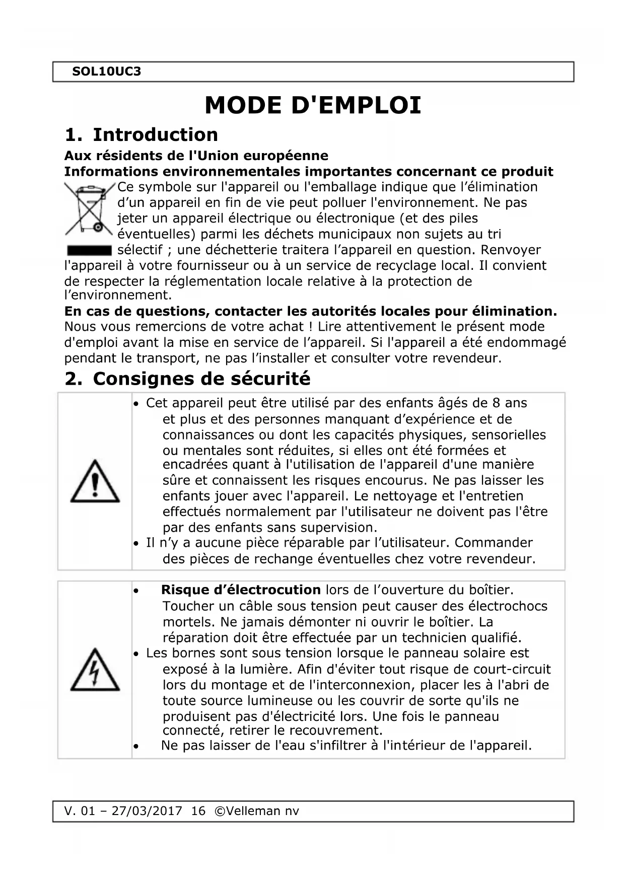Retrouvez gratuitement la notice de l'appareil SOL10UC3 VELLEMAN au format PDF.