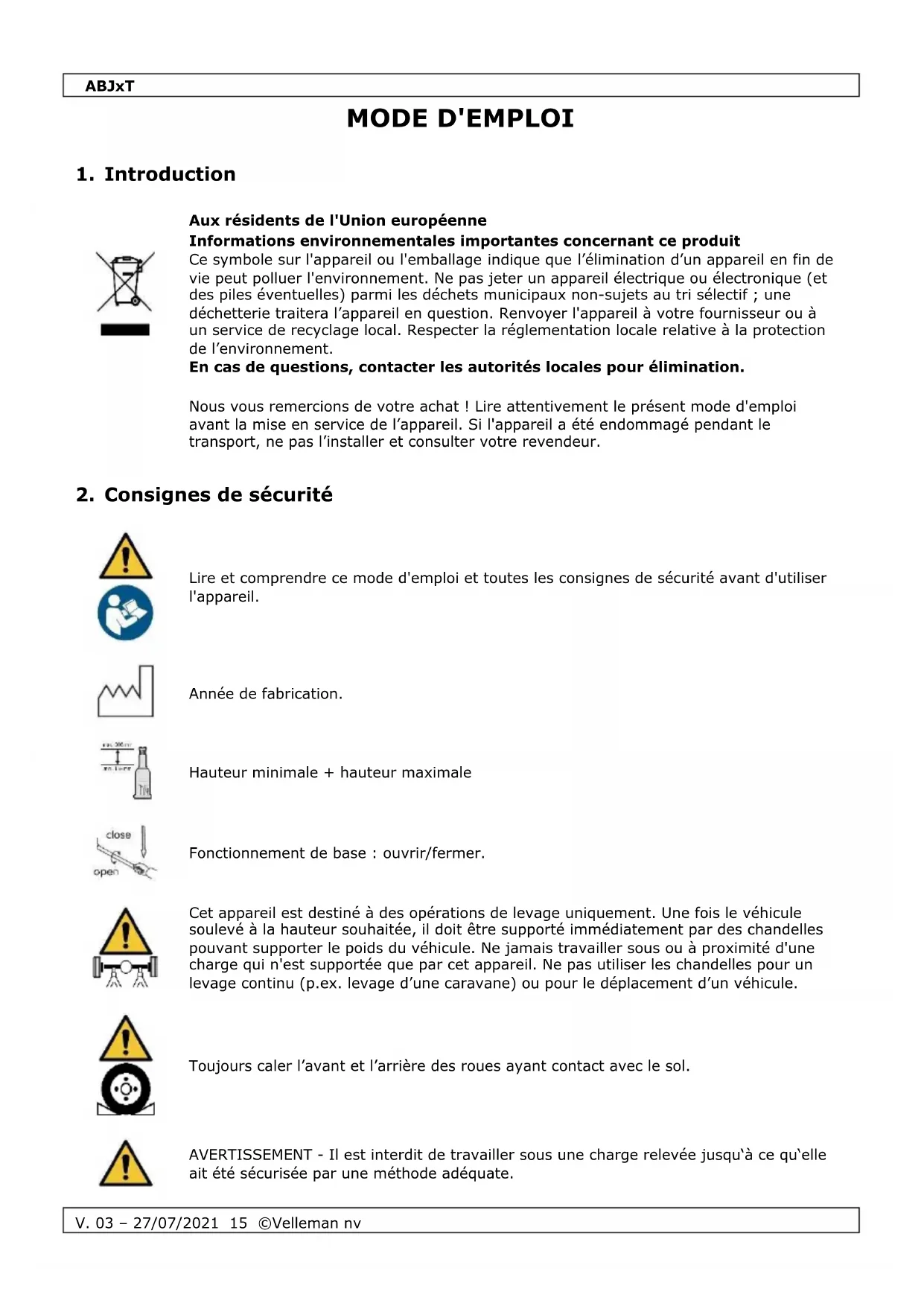 Cet appareil est destiné à des opérations de levage uniquement. Une fois le véhicule soulevé à la hauteur souhaitée, il doit être supporté immédiatement par des chandelles pouvant supporter le poids du véhicule. Ne jamais travailler sous ou à proximité d'une charge qui n'est supportée que par cet appareil. Ne pas utiliser les chandelles pour un levage continu (p.ex. levage d’une caravane) ou pour le déplacement d’un véhicule.