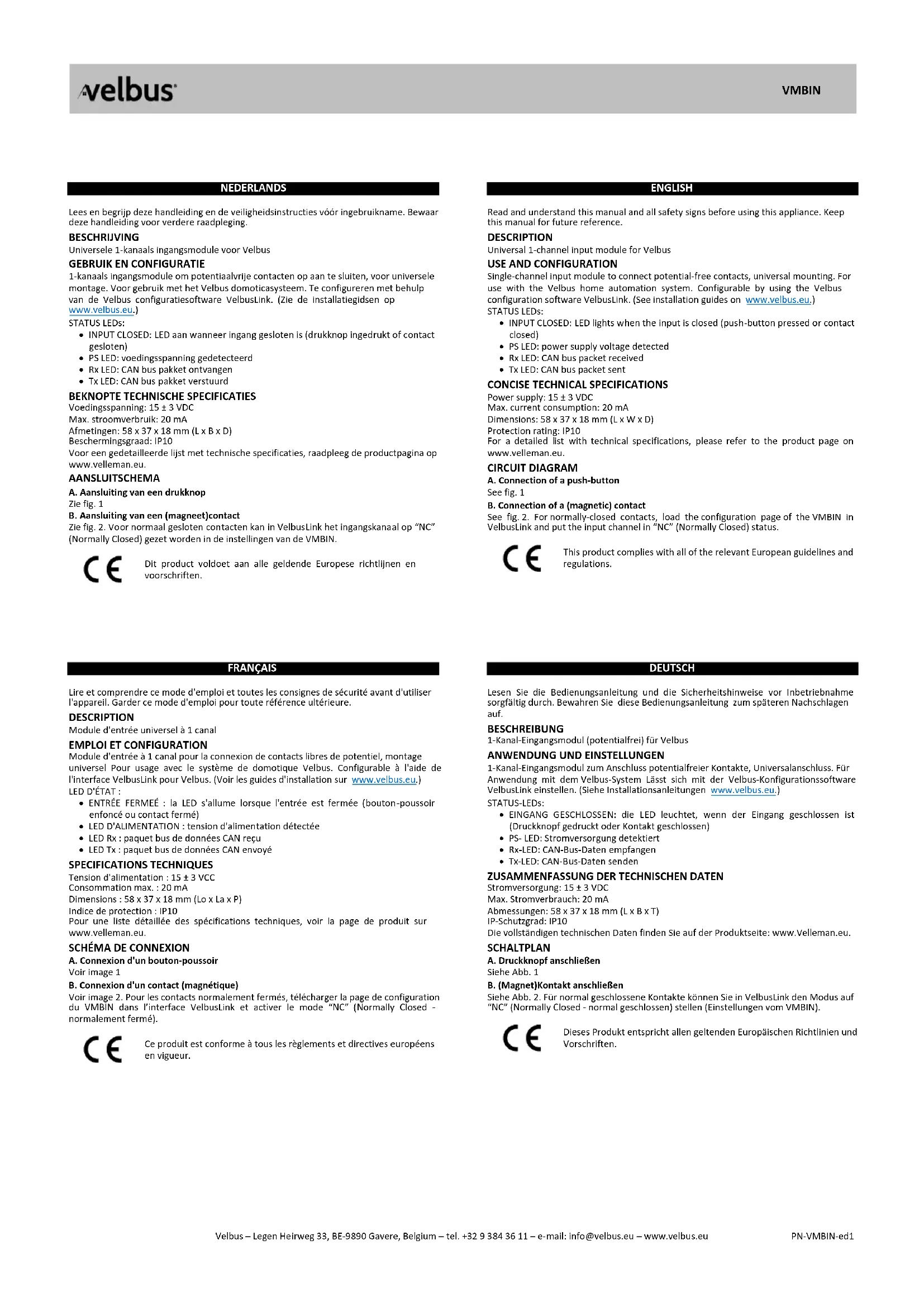 Retrouvez gratuitement la notice de l'appareil VMBIN Velbus au format PDF.