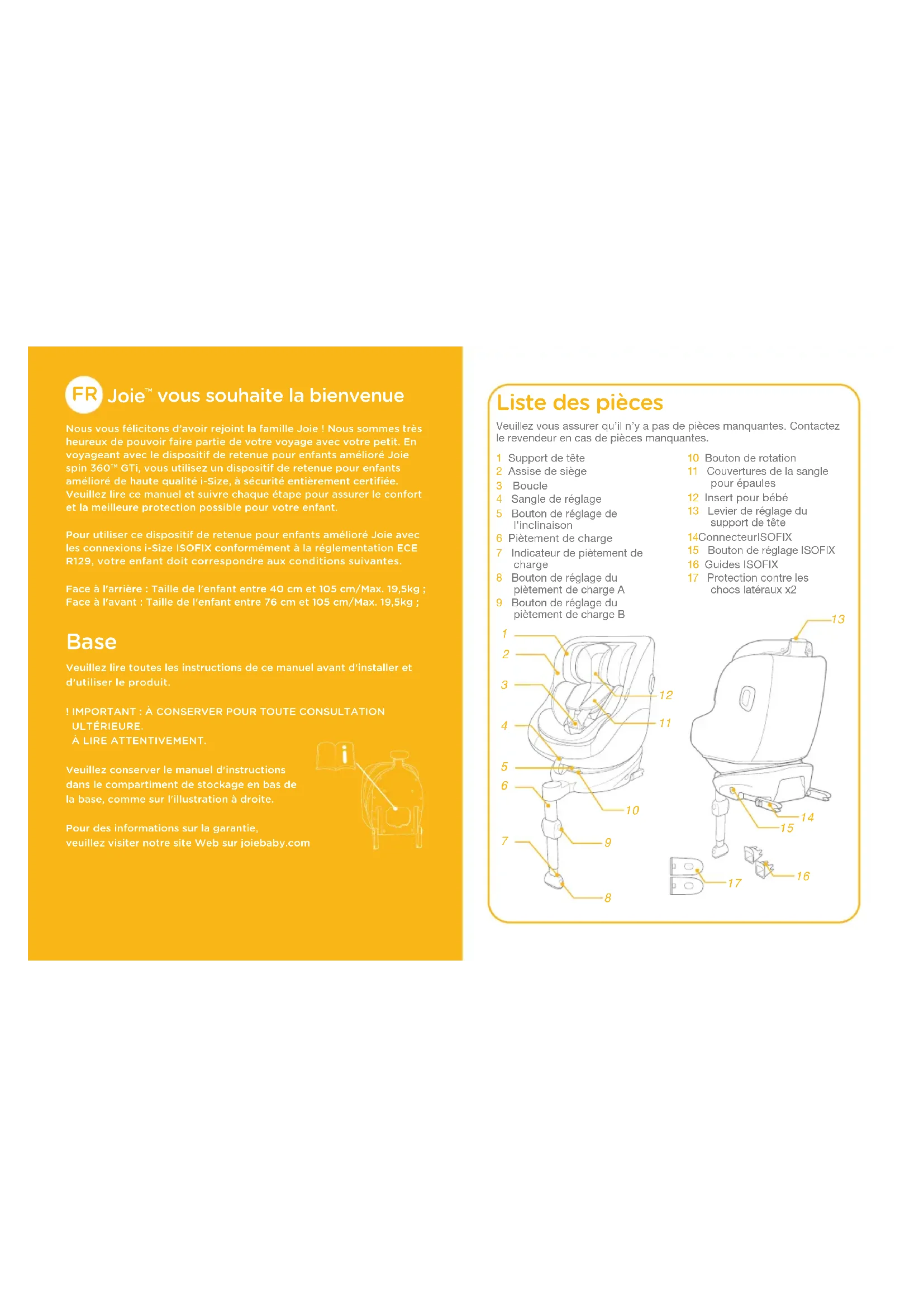 vous souhaite la bienvenue Nous vous félicitons d’avoir rejoint la famille Joie ! Nous sommes très heureux de pouvoir faire partie de votre voyage avec votre petit. En voyageant avec le dispositif de retenue pour enfants amélioré Joie spin 360™ GTi, vous utilisez un dispositif de retenue pour enfants amélioré de haute qualité i-Size, à sécurité entièrement certifiée. Veuillez lire ce manuel et suivre chaque étape pour assurer le confort et la meilleure protection possible pour votre enfant.Pour utiliser ce dispositif de retenue pour enfants amélioré Joie avec les connexions i-Size ISOFIX conformément à la réglementation ECE R129, votre enfant doit correspondre aux conditions suivantes.Face à l'arrière : Taille de l'enfant entre 40 cm et 105 cm/Max. 19,5kg ;Face à l'avant : Taille de l'enfant entre 76 cm et 105 cm/Max. 19,5kg ; Base Veuillez lire toutes les instructions de ce manuel avant d'installer et d'utiliser le produit.! IMPORTANT : À CONSERVER POUR TOUTE CONSULTATION ULTÉRIEURE.À LIRE ATTENTIVEMENT.Veuillez conserver le manuel d'instructions dans le compartiment de stockage en bas de la base, comme sur l'illustration à droite.Pour des informations sur la garantie, veuillez visiter notre site Web sur joiebaby.com Liste des pièces 1 Support de tête2 Assise de siège3 Boucle4 Sangle de réglage5 Bouton de réglage de l'inclinaison6 Piètement de charge7 Indicateur de piètement de charge8 Bouton de réglage du piètement de charge A9 Bouton de réglage du piètement de charge B10 Bouton de rotation11 Couvertures de la sangle pour épaules12 Insert pour bébé 13 Levier de réglage du support de tête14 Connecteur ISOFIX15 Bouton de réglage ISOFIX16 Guides ISOFIX17 Protection contre les chocs latéraux x2Veuillez vous assurer qu’il n’y a pas de pièces manquantes. Contactez le revendeur en cas de pièces manquantes.