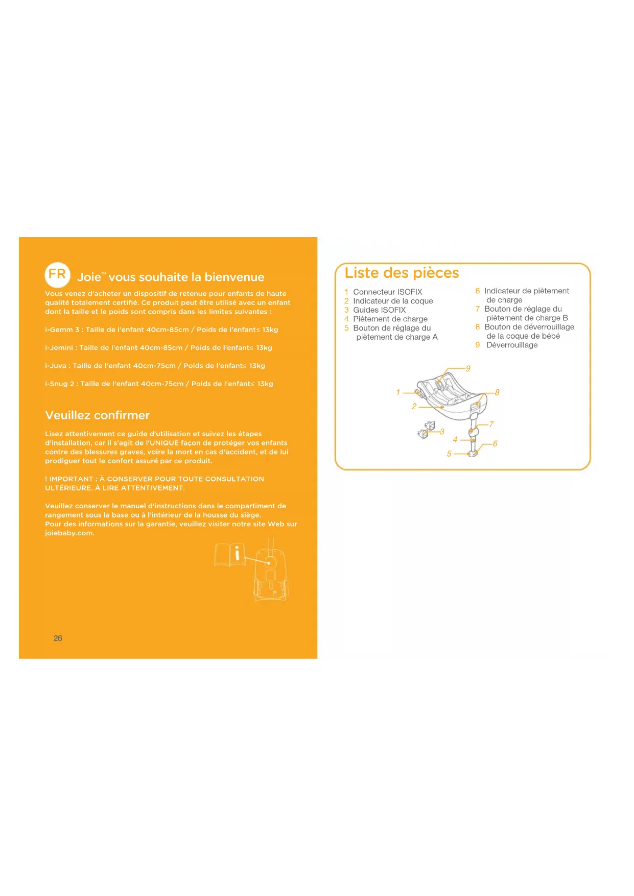 vous souhaite la bienvenue Vous venez d'acheter un dispositif de retenue pour enfants de haute qualité totalement certifié. Ce produit peut être utilisé avec un enfant dont la taille et le poids sont compris dans les limites suivantes :i-Gemm 3 : Taille de l'enfant 40cm-85cm / Poids de l'enfant 13kgi-Jemini : Taille de l’enfant 40cm-85cm / Poids de l’enfant 13kgi-Juva : Taille de l'enfant 40cm-75cm / Poids de l'enfant 13kgi-Snug 2 : Taille de l'enfant 40cm-75cm / Poids de l'enfant 13kg Veuillez confirmer Lisez attentivement ce guide d’utilisation et suivez les étapes d'installation, car il s'agit de l'UNIQUE façon de protéger vos enfants contre des blessures graves, voire la mort en cas d'accident, et de lui prodiguer tout le confort assuré par ce produit.! IMPORTANT : À CONSERVER POUR TOUTE CONSULTATION ULTÉRIEURE. À LIRE ATTENTIVEMENT.Veuillez conserver le manuel d'instructions dans le compartiment de rangement sous la base ou à l’intérieur de la housse du siège.Pour des informations sur la garantie, veuillez visiter notre site Web sur joiebaby.com. 6 Indicateur de piètement de charge 7 Bouton de réglage du piètement de charge B 8 Bouton de déverrouillage de la coque de bébé 9 Déverrouillage