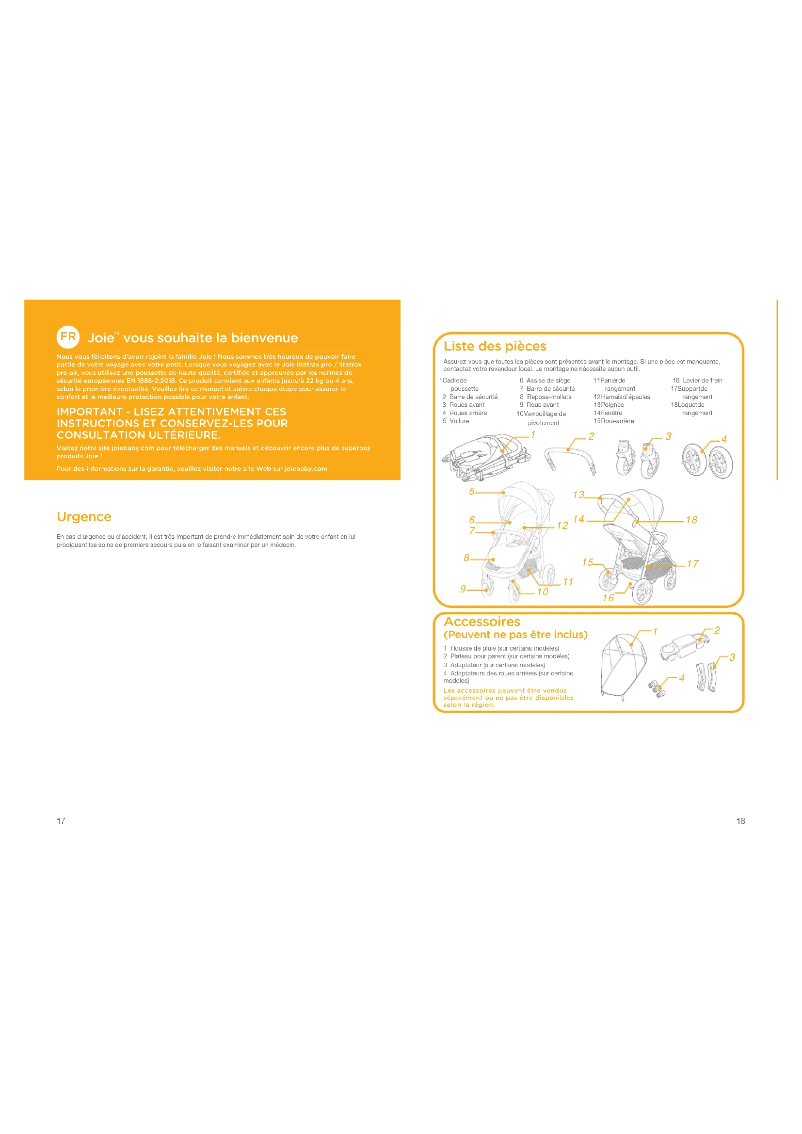 vous souhaite la bienvenue Nous vous félicitons d’avoir rejoint la famille Joie ! Nous sommes très heureux de pouvoir faire partie de votre voyage avec votre petit. Lorsque vous voyagez avec le Joie litetrax pro / litetrax pro air, vous utilisez une poussette de haute qualité, certifiée et approuvée par les normes de sécurité européennes EN 1888-2:2018. Ce produit convient aux enfants jusqu'à 22 kg ou 4 ans, selon la première éventualité. Veuillez lire ce manuel et suivre chaque étape pour assurer le confort et la meilleure protection possible pour votre enfant.