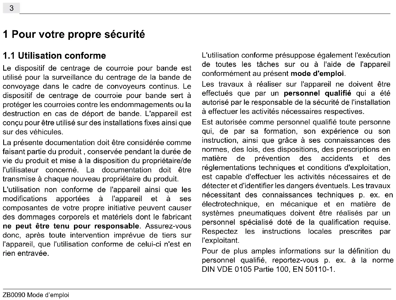 Le dispositif de centrage de courroie pour bande est utilisé pour la surveillance du centrage de la bande de convoyage dans le cadre de convoyeurs continus. Le dispositif de centrage de courroie pour bande sert à protéger les courroies contre les endommagements ou la destruction en cas de déport de bande. L'appareil est conçu pour être utilisé sur des installations fixes ainsi que sur des véhicules. La présente documentation doit être considérée comme faisant partie du produit , conservée pendant la durée de vie du produit et mise à la disposition du propriétaire/de l'utilisateur concerné. La documentation doit être transmise à chaque nouveau propriétaire du produit. L'utilisation non conforme de l'appareil ainsi que les modifications apportées à l'appareil et à ses composantes de votre propre initiative peuvent causer des dommages corporels et matériels dont le fabricant ne peut être tenu pour responsable. Assurez-vous donc, après toute intervention imprévue de tiers sur l'appareil, que l'utilisation conforme de celui-ci n'est en rien entravée. L'utilisation conforme présuppose également l'exécution de toutes les tâches sur ou à l'aide de l'appareil conformément au présent mode d'emploi. Les travaux à réaliser sur l'appareil ne doivent être effectués que par un personnel qualifié qui a été autorisé par le responsable de la sécurité de l'installation à effectuer les activités nécessaires respectives. Est autorisée comme personnel qualifié toute personne qui, de par sa formation, son expérience ou son instruction, ainsi que grâce à ses connaissances des normes, des lois, des dispositions, des prescriptions en matière de prévention des accidents et des réglementations techniques et conditions d'exploitation, est capable d'effectuer les activités nécessaires et de détecter et d'identifier les dangers éventuels. Les travaux nécessitant des connaissances techniques p. ex. en électrotechnique, en mécanique et en matière de systèmes pneumatiques doivent être réalisés par un personnel spécialisé doté de la qualification requise. Respectez les instructions locales prescrites par l'exploitant. Pour de plus amples informations sur la définition du personnel qualifié, reportez-vous p. ex. à la norme DIN VDE 0105 Partie 100, EN 50110-1.4 Mode d’emploi ZB0090