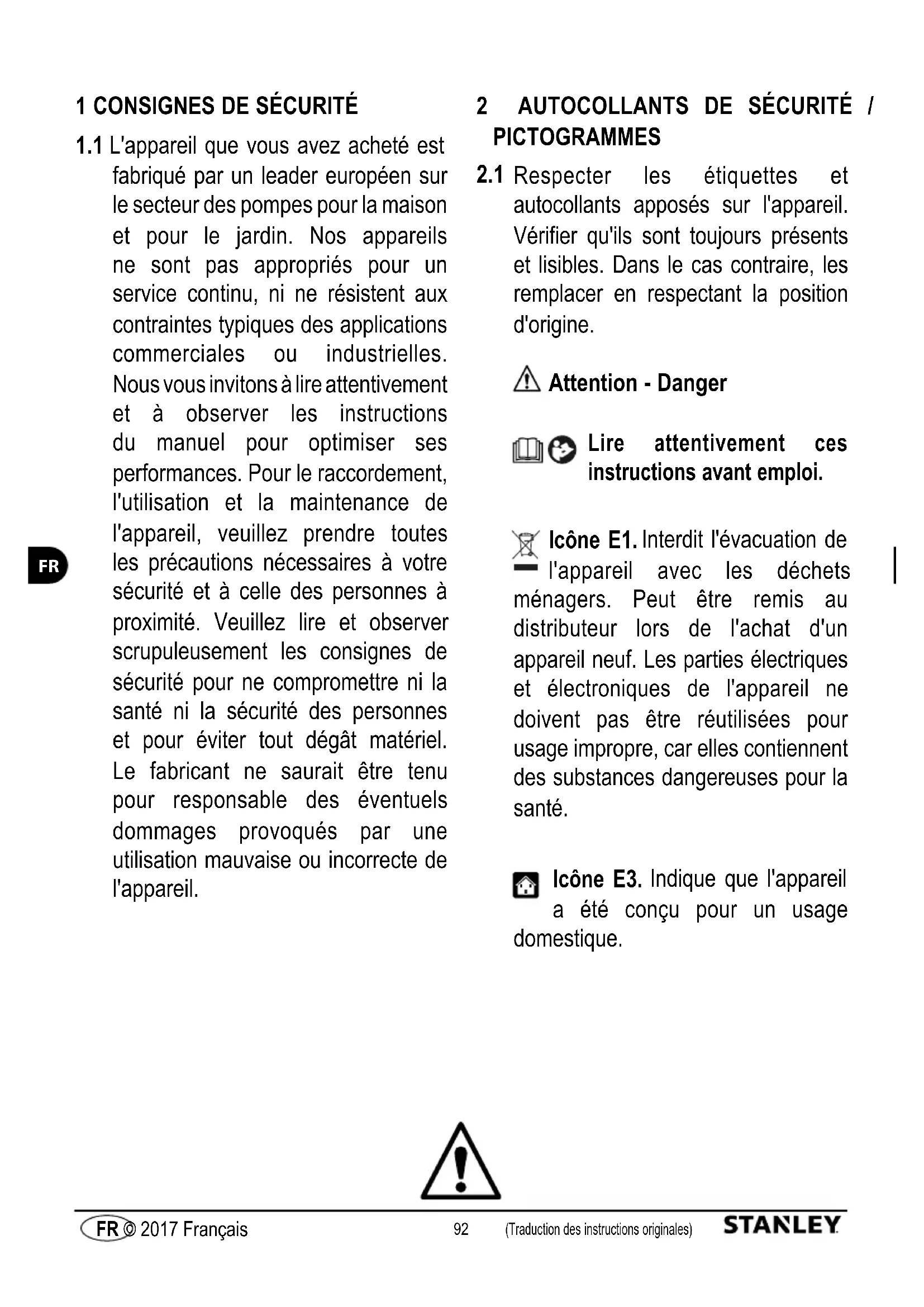 Respecter les étiquettes et autocollants apposés sur l'appareil. Vérifier qu'ils sont toujours présents et lisibles. Dans le cas contraire, les remplacer en respectant la position d'origine. Attention - Danger Lire attentivement ces instructions avant emploi. Icône E1. Interdit l'évacuation de l'appareil avec les déchets ménagers. Peut être remis au distributeur lors de l'achat d'un appareil neuf. Les parties électriques et électroniques de l'appareil ne doivent pas être réutilisées pour usage impropre, car elles contiennent des substances dangereuses pour la santé. Icône E3. Indique que l'appareil a été conçu pour un usage domestique.93 (Traduction des instructions originales) FR © 2017 Français