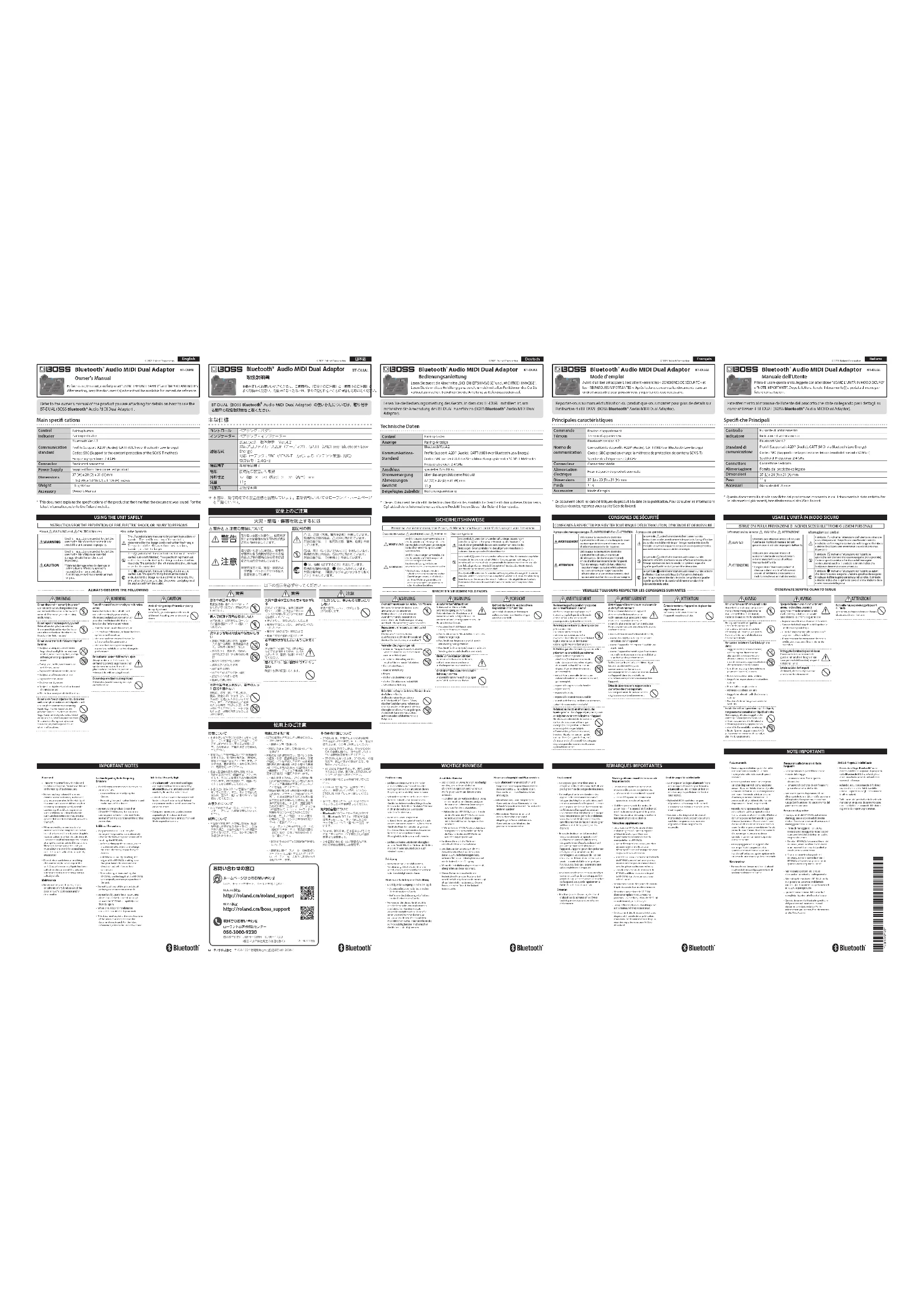 AVERTISSEMENT Ne démontez pas l’appareil et n’y apportez aucune modification vous-mêmeN’e ectuez aucune opération sauf instruction spécifique dans le mode d’emploi. Vous risquez sinon de provoquer des dysfonctionnements.Ne tentez pas de réparer ou de remplacer des pièces vous-mêmePour toute intervention de maintenance, contactez votre revendeur, le centre de service Roland le plus proche ou un distributeur Roland agréé (voir «Informations»).Ne l’utilisez pas et ne le stockez pas dans un lieu présentant les caractéristiques suivantes• exposé à des températures extrêmes (à la lumière directe du soleil dans un véhicule fermé, près d’un conduit chau é ou sur un dispositif générateur de chaleur, par exemple);• embué (dans une salle de bains, un cabinet de toilette ou sur un sol mouillé, par exemple);• exposé à la vapeur ou à la fumée;• exposé au sel;• exposé à la pluie;• exposé à la poussière ou au sable;• soumis à de fortes vibrations ou secousses;• placé dans un endroit mal aéré.Ne laissez pas des objets étrangers ou des liquides pénétrer dans l’appareil; ne placez jamais de récipients contenant du liquide sur l’appareilNe placez pas de récipients contenant du liquide (des vases à eurs, par exemple) sur ce produit. Ne laissez aucun objet étranger (objets in ammables, pièces de monnaie, broches, fils, etc.), ni aucun liquide quel qu’il soit (eau, jus de fruit, etc.) s’introduire dans l’appareil. Vous risquez de provoquer des courts-circuits ou un dysfonctionnement. ATTENTION Évitez de monter sur l’appareil ou de placer des objets lourds dessusVous risquez de vous blesser si l’appareil bascule ou chute.Emplacement• Cet appareil peut interférer avec la réception radio et télévision. Ne l’utilisez pas à proximité de ce type de récepteurs.• Un bruit peut se faire entendre si des appareils de communication sans fil, tels que des téléphones cellulaires, sont utilisés à proximité de l’appareil. Ce bruit peut se produire lors de la réception ou de l’émission d’un appel ou pendant une conversation téléphonique. Lorsque vous rencontrez ce genre de problèmes, vous devez soit déplacer les appareils sans fil concernés de façon à les éloigner su isamment de l’appareil, soit les éteindre.• En cas de déplacement d’un endroit vers un autre où la température et/ou l’humidité sont très di érentes, des gouttelettes d’eau (condensation) peuvent se former à l’intérieur de l’appareil. L’appareil peut alors présenter des dysfonctionnements ou des dommages si vous essayez de l’utiliser dans ces conditions. Avant de vous en servir, il convient d’attendre quelques heures, jusqu’à ce que la condensation soit complètement évaporée.• Ne placez pas de récipient ou autre objet contenant du liquide sur cet appareil. Si jamais du liquide se déverse sur la surface de l’appareil, essuyez-le rapidement à l’aide d’un chi on doux et sec.Entretien• N’utilisez jamais d’essence, de diluant, d’alcool ou de solvants afin d’éviter tout risque de décoloration et/ou de déformation.Mise en garde concernant les émissions de fréquences radio• Les actions suivantes peuvent vous exposer à des poursuites judiciaires.• Désassembler ou modifier l’appareil.• Retirer l’étiquette de certification apposée au dos de cet appareil.• N’utilisez pas ce produit à moins de 22cm (8 à 11/16pouces) de l’endroit où un stimulateur cardiaque est implanté. Vous risques sinon de compromettre le fonctionnement de ce dernier.Précautions supplémentaires• Les pièces du BT-DUAL peuvent être endommagées si l’unité est exposée à l’électricité statique. Observez les précautions suivantes lors de la manipulation du BT-DUAL.• Avant d’attraper le BT-DUAL, touchez un autre objet métallique pour décharger l’électricité statique de votre corps ou de vos vêtements.• Tenez le BT-DUAL en touchant les bords du BT-DUAL, en veillant à ce que vos mains n’entrent pas en contact direct avec les pièces ou les connecteurs.• Lors du stockage ou du transport du BT-DUAL, utilisez le sac dans lequel le BT-DUAL était lorsque vous avez acheté l’unité.• Ne touchez aucune des pistes de circuits imprimés ou des bornes de connexion.• Ne rentrez pas de force le BT-DUAL dans son emplacement. Si vous ne parvenez pas à le fixer, retirez-le BT-DUAL complètement, puis réessayez.• Lorsque l’installation du circuit imprimé est terminée, vérifiez votre travail.• Ce document décrit les caractéristiques du produit à la date de sa publication. Pour consulter les informations les plus récentes, reportez-vous au site Web de Roland.Droit de propriété intellectuelle• La marque et les logos Bluetooth® sont des marques déposées appartenant à Bluetooth SIG, Inc. et toute utilisation de ces marques par Roland s’e ectue sous licence.• Roland et BOSS sont des marques déposées ou des marques de Roland Corporation aux États-Unis et/ou dans d’autres pays.• Les noms d’entreprise et de produit mentionnés dans le présent document sont des marques ou des marques déposées de leurs propriétaires respectifs. Mode d’emploi Avant d’utiliser cet appareil, lisez attentivement les «CONSIGNES DE SÉCURITÉ» et les «REMARQUES IMPORTANTES». Après lecture, conservez les documents dans un endroit accessible pour pouvoir vous y reporter dès que nécessaire. Reportez-vous au manuel d’utilisation du produit que vous montez pour plus de détails sur l’utilisation du BT-DUAL (BOSS Bluetooth® Audio MIDI Dual Adaptor). © 2021 Roland Corporation Principales caractéristiques Commande Bouton d’appariement Témoin Témoin d’appariement Norme de communication Bluetooth version 4.2Compatibilité de profil: A2DP (Audio), GATT (MIDI sur Bluetooth Low Energy)Codec: SBC (prend en charge la méthode de protection de contenu SCMS-T)Spectre des