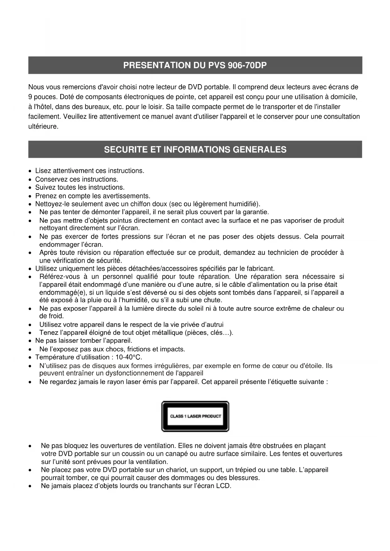 signaletiQUE ____________________________________________________________ 19 Dépannage ______________________________________________________________ 20 SOMMAIREGarantie et SAV _________________________________________________________ 21Nous vous remercions d'avoir choisi notre lecteur de DVD portable. Il comprend deux lecteurs avec écrans de 9 pouces. Doté de composants électroniques de pointe, cet appareil est conçu pour une utilisation à domicile, à l'hôtel, dans des bureaux, etc. pour le loisir. Sa taille compacte permet de le transporter et de l'installer facilement. Veuillez lire attentivement ce manuel avant d'utiliser l'appareil et le conserver pour une consultation ultérieure.