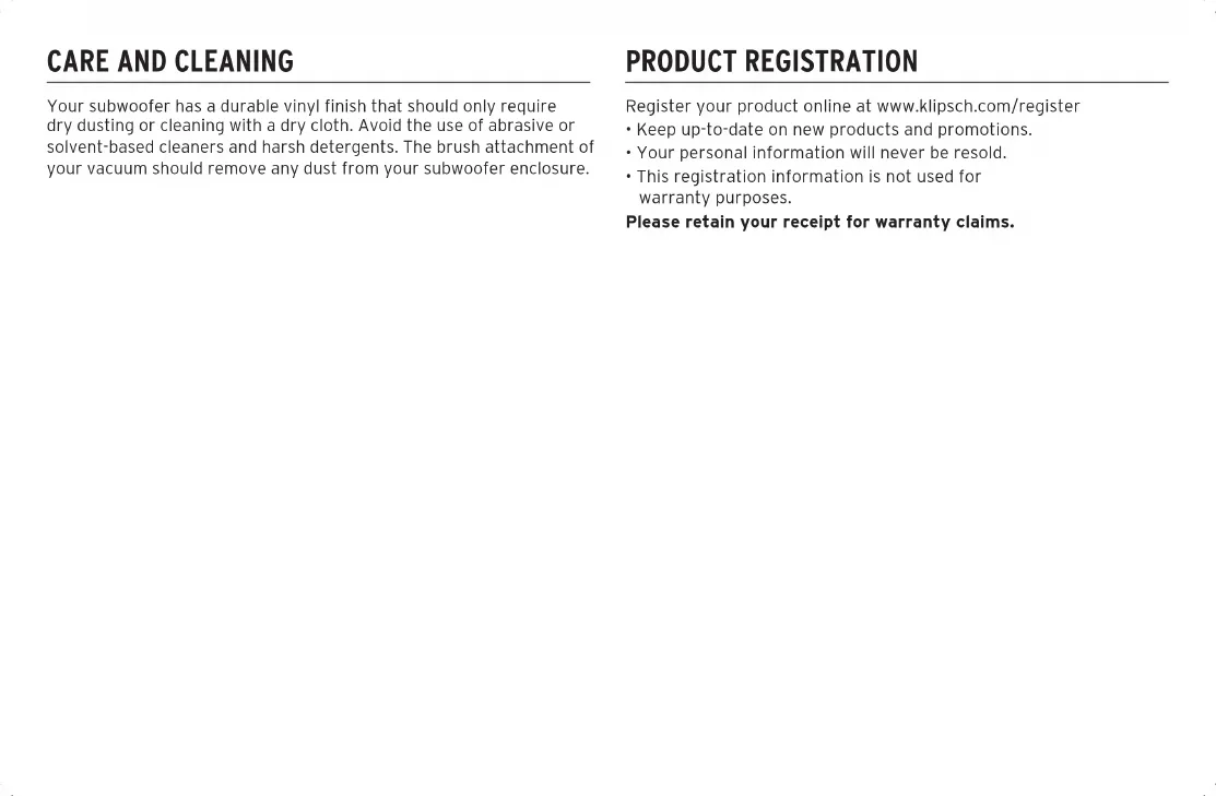 Récepteur A/V surround Récepteur A/V surroundLa finition vinyle résistante de votre caisson de graves ne nécessite qu’un dépoussiérage ou un nettoyage au chiffon sec. Évitez d’utiliser des produits de nettoyage abrasifs ou à base de solvant ainsi que des détergents agressifs. La brosse de votre aspirateur devrait être suffisante pour nettoyer la poussière de votre caisson de graves.